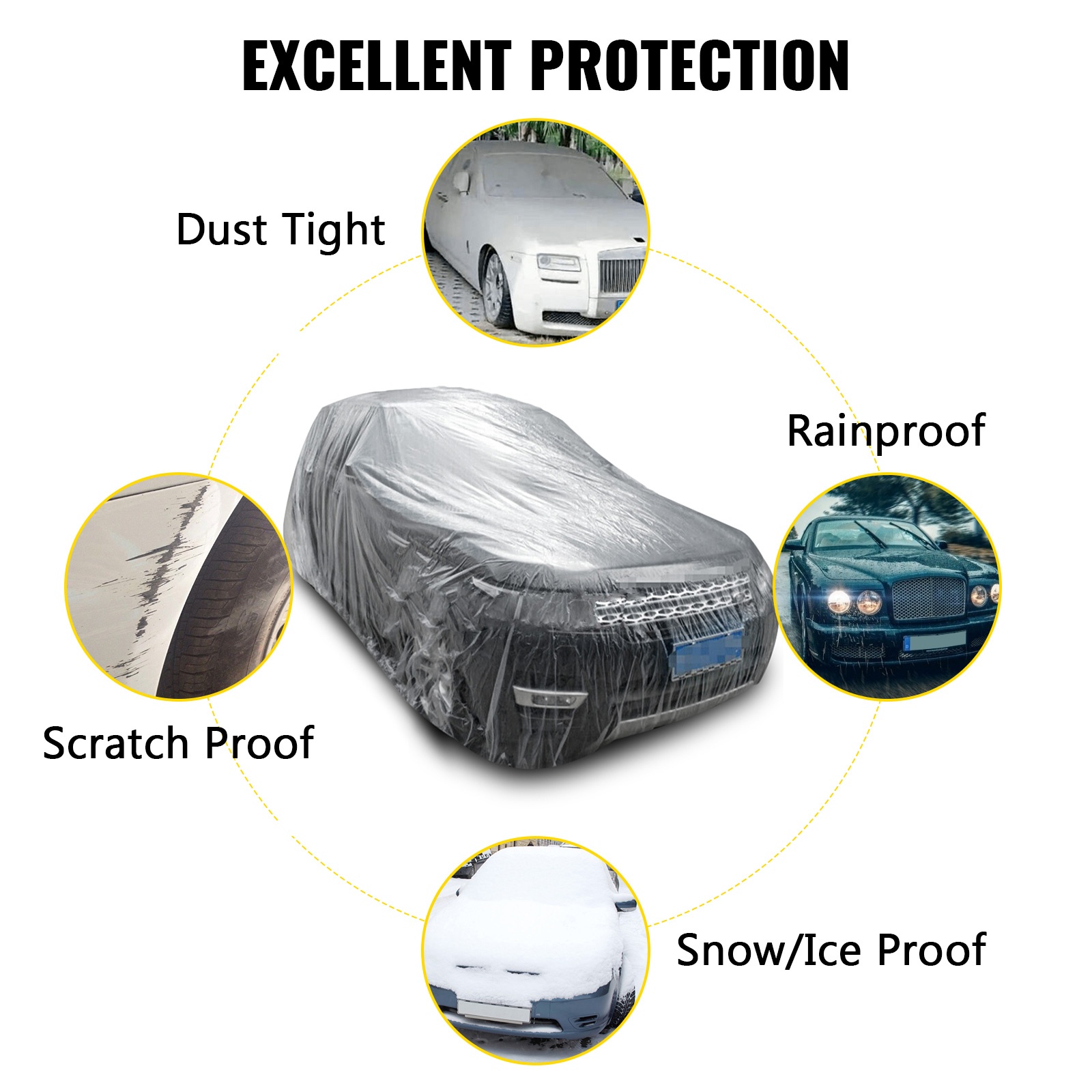 Läpinäkyvä muovinen auton suojapeite on valmistettu matalatiheyksisestä polyeteenimuovista. Se on vedenpitävä ja suojaa autoa lialta, pölyltä, jäältä, lumelta ja muilta epäpuhtauksilta. Kevyen rakenteen ansiosta peite on helppo asettaa paikalleen ja poistaa, ja koko sopii useimpiin henkilöautoihin.