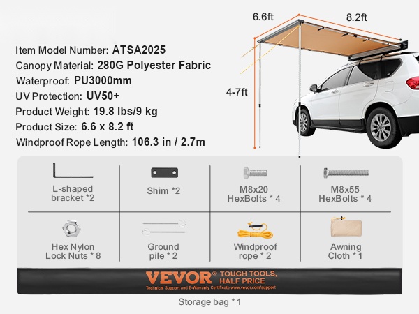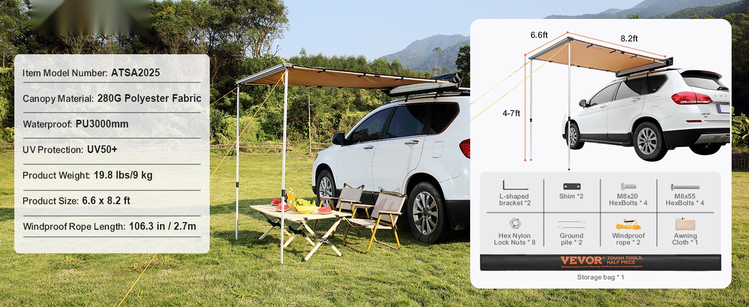 Tämä helposti mukana kulkeva ajoneuvomarkiisi tarjoaa tilavan 4.6 x 6.6 jalkaa kokoisen suojan auringolta ja sateelta. Kankaassa on UV50+ -suoja, PU3000mm -vesipilariarvo sekä lämpöä eristävät ominaisuudet. Markiisi toimitetaan vedenpitävässä PVC-säilytyslaukussa, joka vie vain vähän tilaa auton katolla. Soveltuu sekä auton sivulle että taakse, tarjoten suojaisan oleskelualueen esimerkiksi piknikeille ja retkeilyyn erilaisissa sääolosuhteissa.