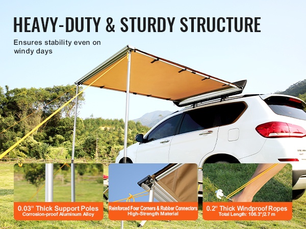 Paksunnetut alumiiniseostangot, neljä vahvistettua kulmaa ja kumiset liitososat muodostavat tukevan rakenteen. Mukana toimitettavat paksut, tuulenkestävät kiinnitysnarut parantavat vakautta ja auttavat pitämään markiisin paikallaan myös tuulisella säällä.