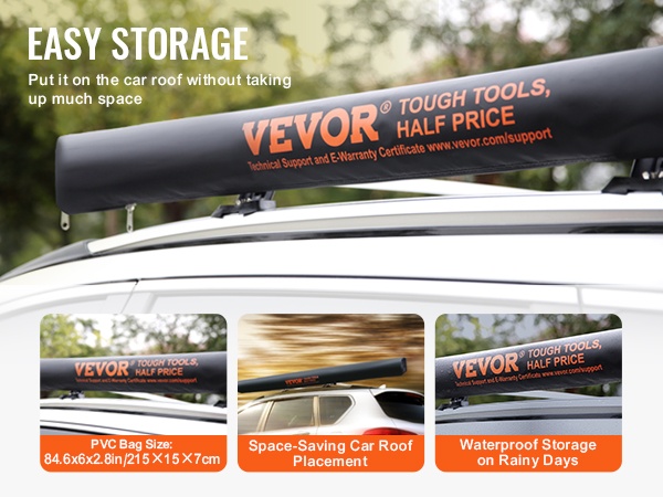 Säilytyslaukun kokonaismitat ovat 61 x 6 x 2.8 tuumaa / 155 × 15 × 7 cm, joten se vie vain vähän tilaa auton katolla. PVC-materiaali on hyvin vedenpitävä, eikä sadevesi pääse läpi, vaikka sää olisi sateinen.