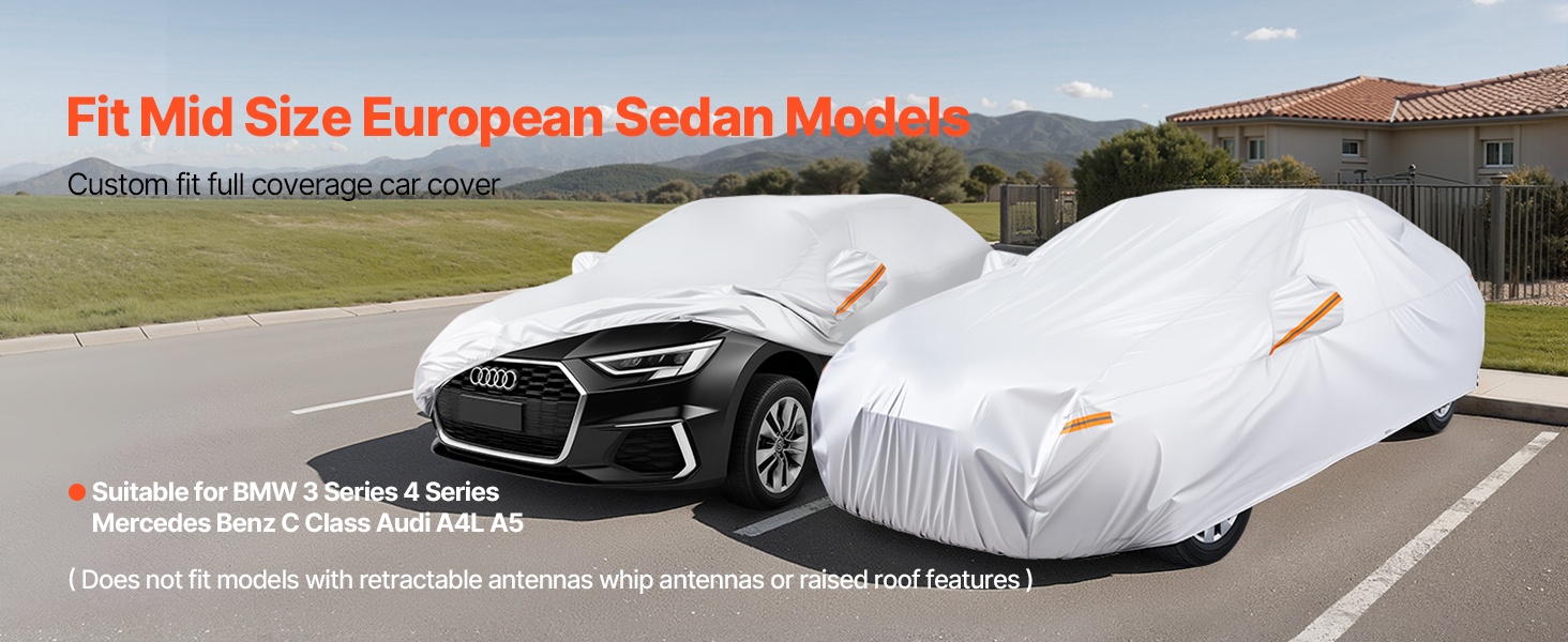 - Kokonaan auton peittävä malli täyskokoisille eurooppalaisille sedan-autoille