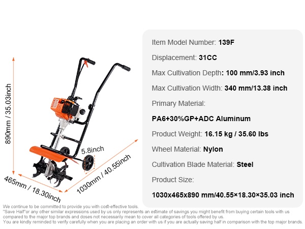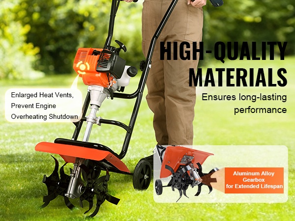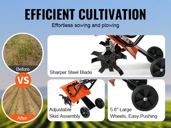 Teräksiset terät kääntävät maan tehokkaasti kylvöä varten. Säädettävä luisti mahdollistaa muokkauksen erilaisissa maastoissa ja syvyyksissä. 5.8 tuuman suuret pyörät helpottavat jyrsimen siirtämistä sekä istutus- että kyntötyövaiheissa.