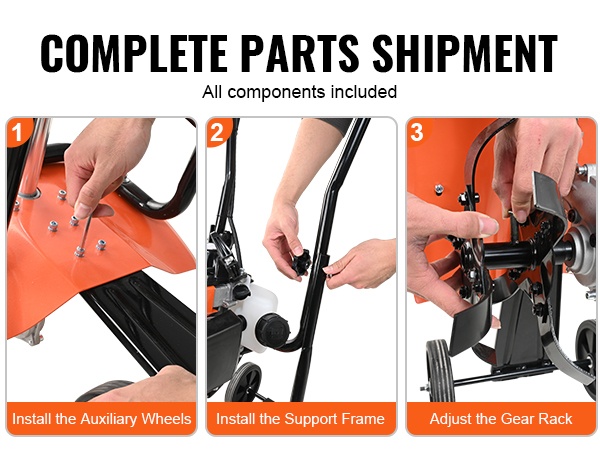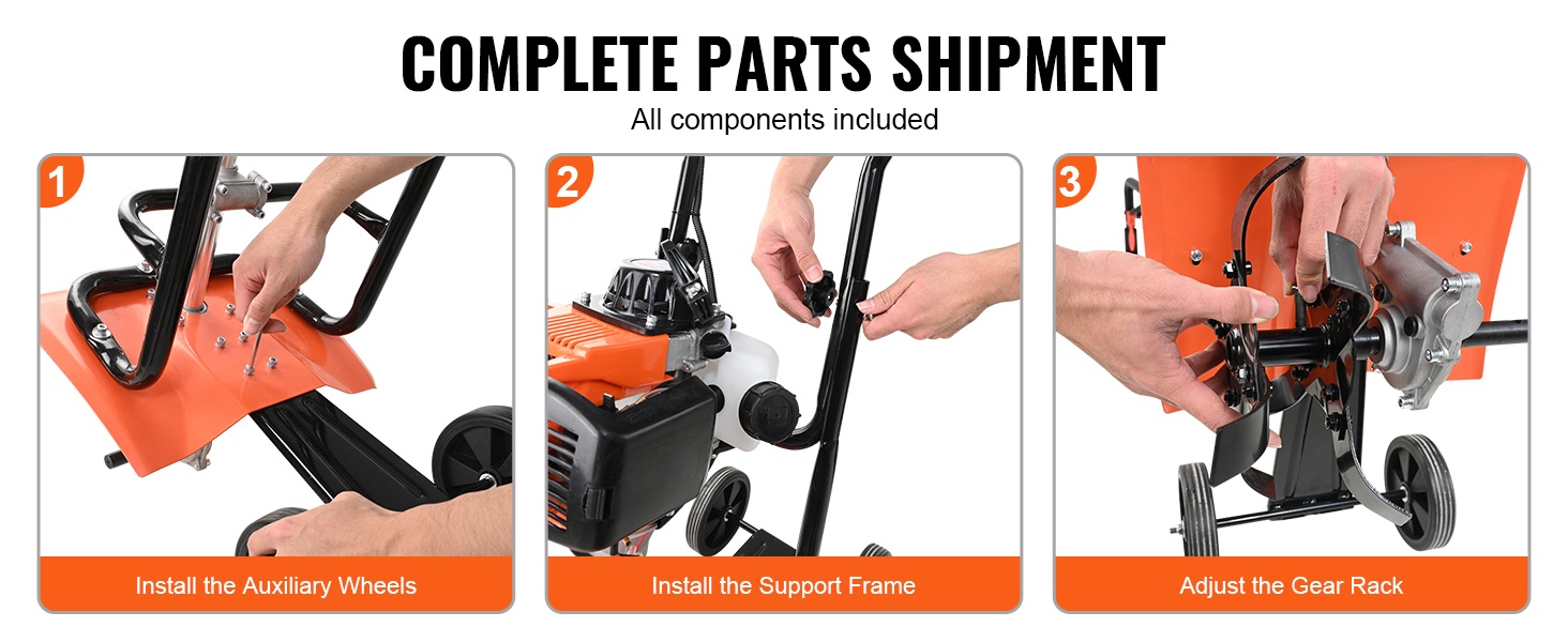 Kaikki tarvittavat osat toimitetaan mukana, ja jyrsimen kokoaminen onnistuu kolmessa perusvaiheessa. Näin pääset nopeasti aloittamaan puutarhatyöt ilman monimutkaista asennusta.
