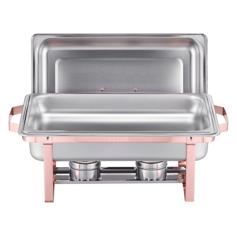Ruostumattomasta teräksestä valmistettu buffet-tarjoilusetti, jossa on 2 suorakulmaista lämpöhaudetta. Kumpikin yksikkö sisältää kannen, vesialtaan, 2 täysikokoista ruoka-astiaa ja polttoainesäiliön. Soveltuu hyvin häihin, juhliin, buffet-tarjoiluun ja muihin tilaisuuksiin. Tyylikäs ruusukullan sävy viimeistelee kattauksen.