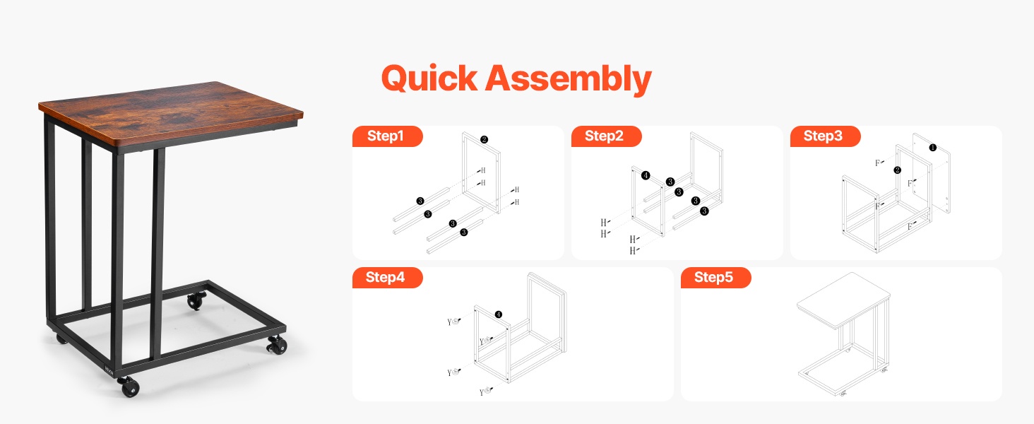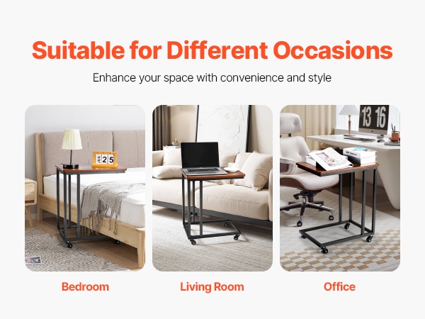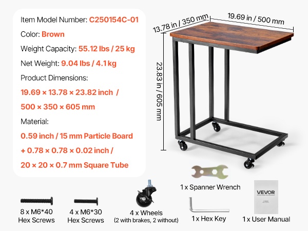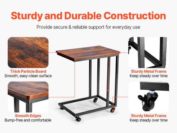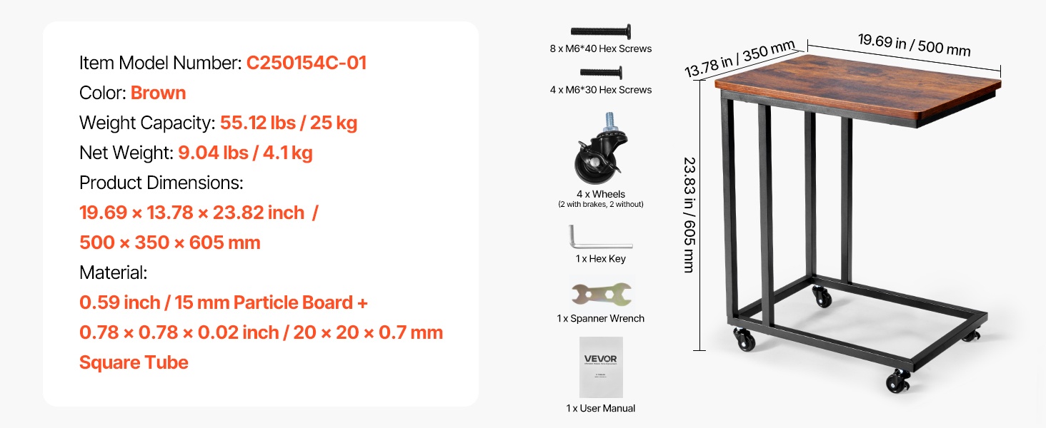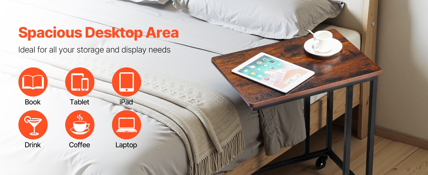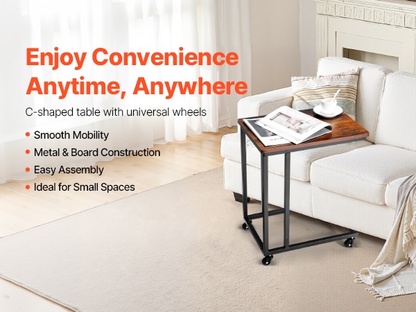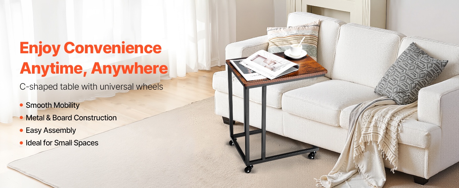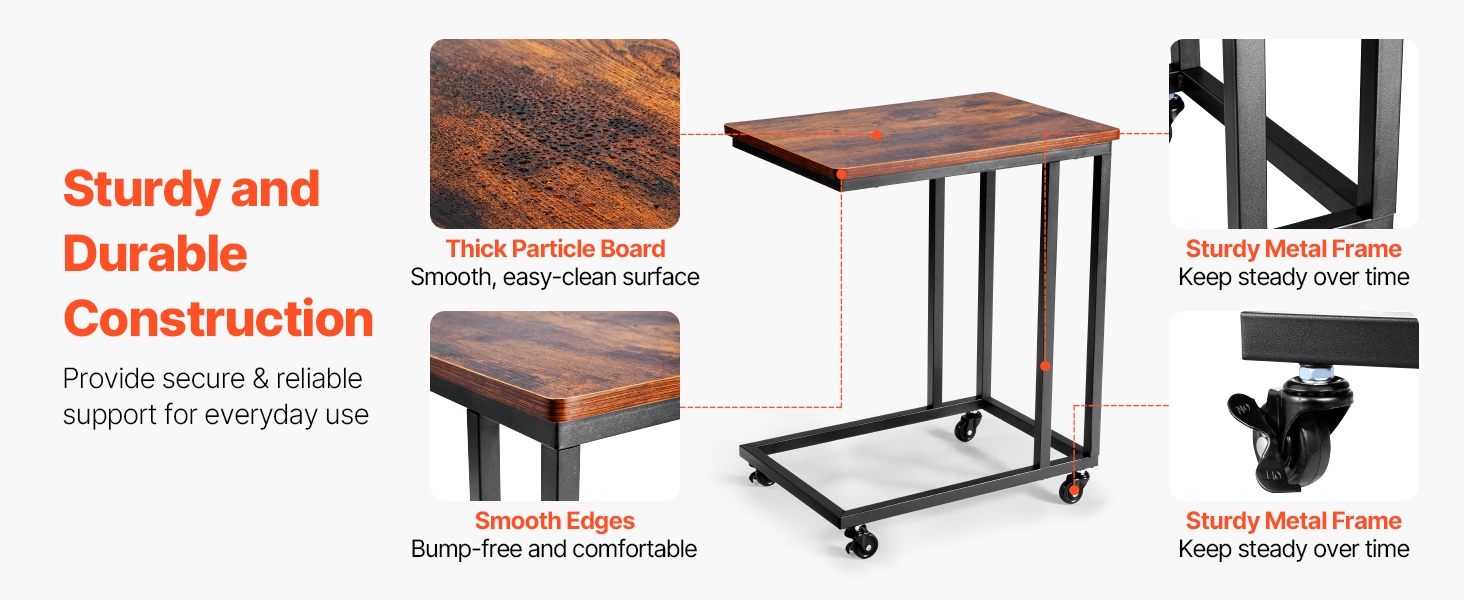C-muotoinen sivupöytä metallirungolla ja MDF-pöytälevyllä pyörillä kantavuus 25 kg