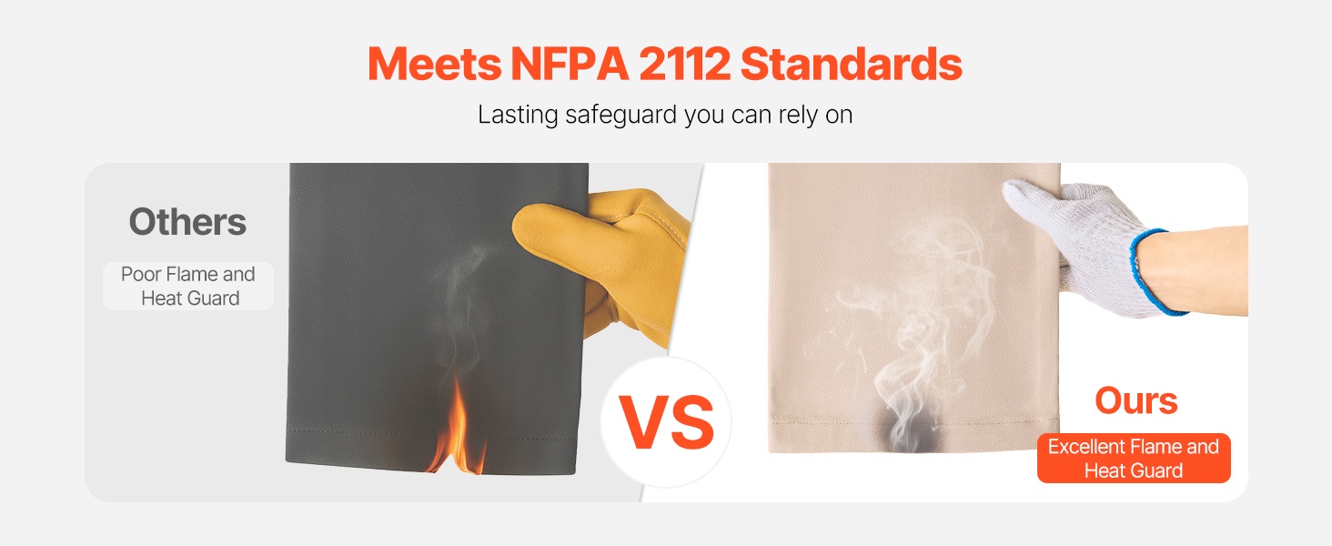 Housut täyttävät NFPA 2112 -standardin vaatimukset pystysuuntaisessa liekkitestissä, lämmönkestävyydessä ja lämpösuojassa. Tämä tarjoaa luotettavan vaihtoehdon työtehtäviin, joissa työskennellään korkeiden lämpötilojen ja kipinöiden läheisyydessä.