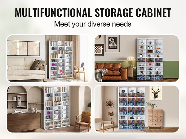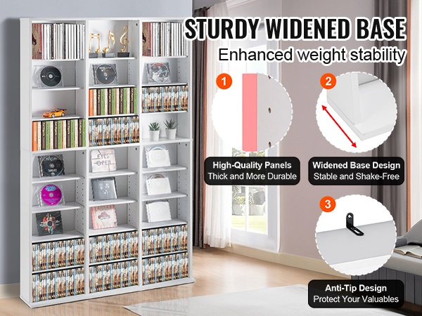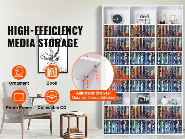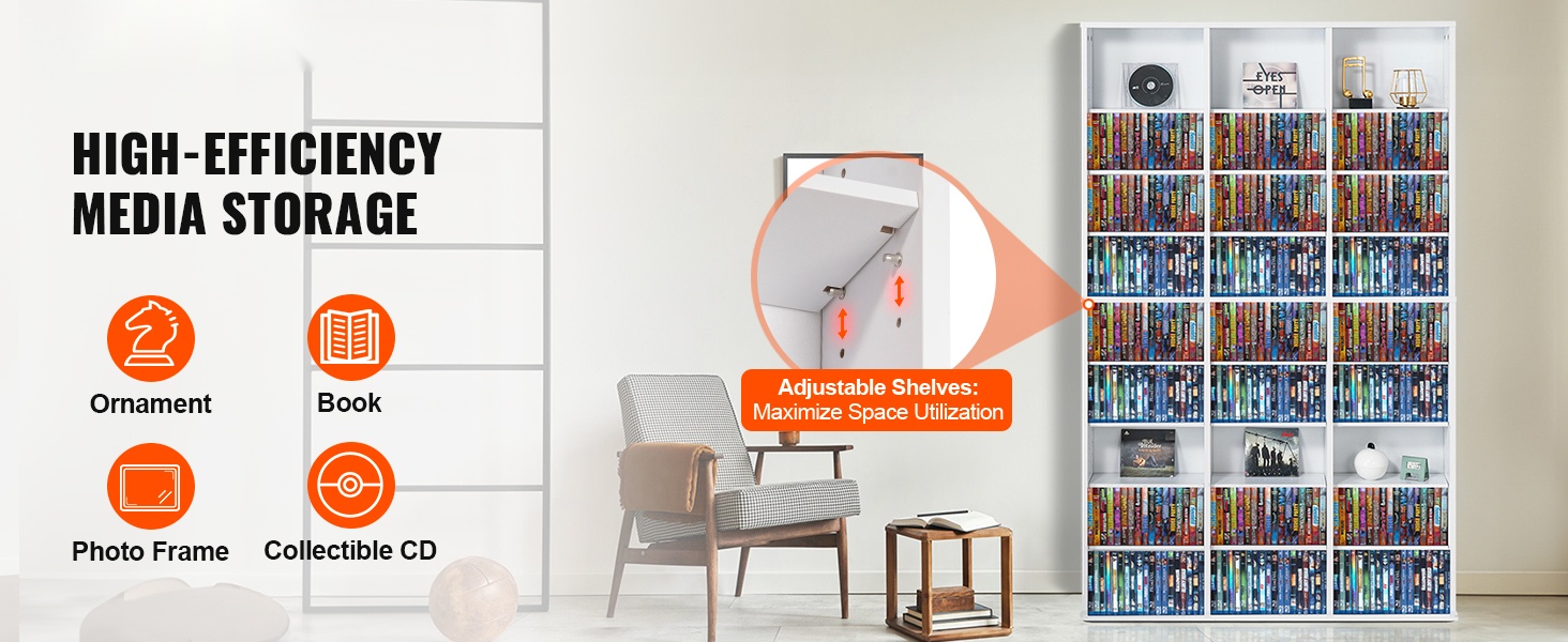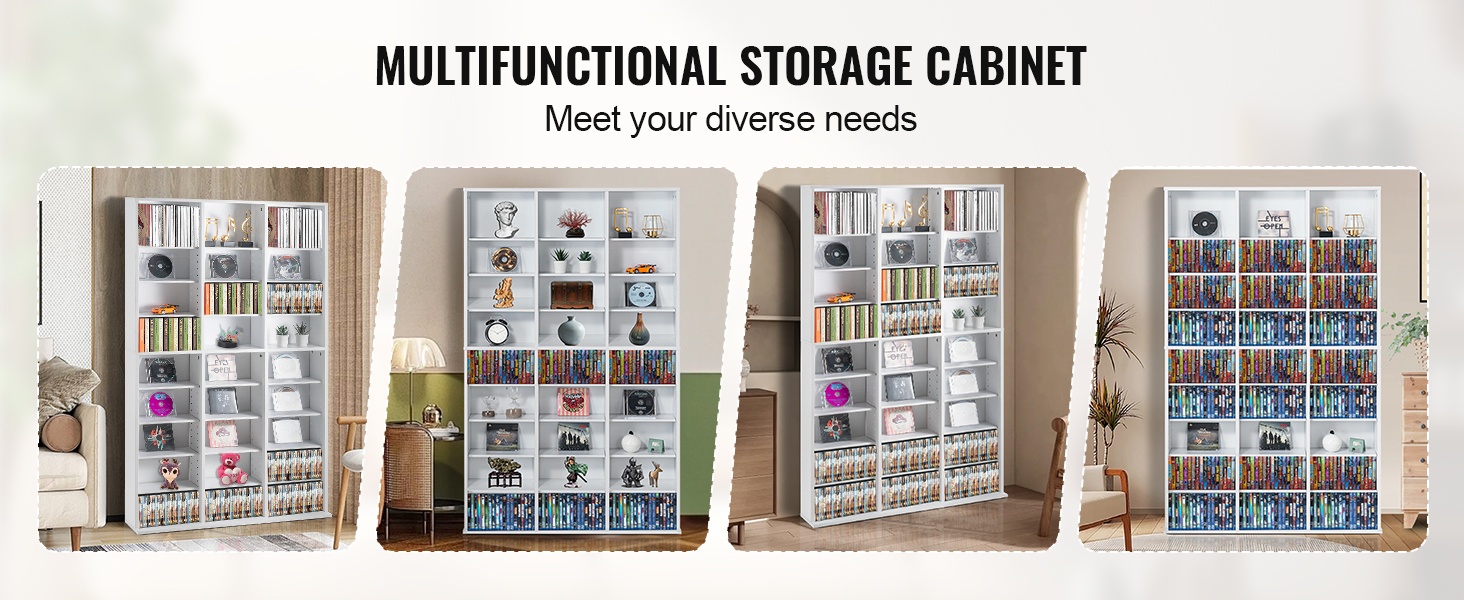 Monikäyttöinen ja muunneltava DVD- ja CD-säilytyskaappi auttaa hyödyntämään tilan tehokkaasti säädettävien hyllyjen ansiosta. Kaappi sopii CD- ja DVD-levyille, kirjoille, pienille koristeille, valokuville ja muisto-esineille ja pitää kokoelmat hyvässä järjestyksessä.