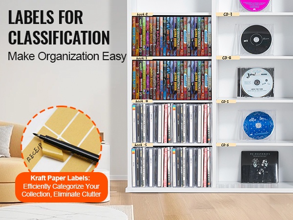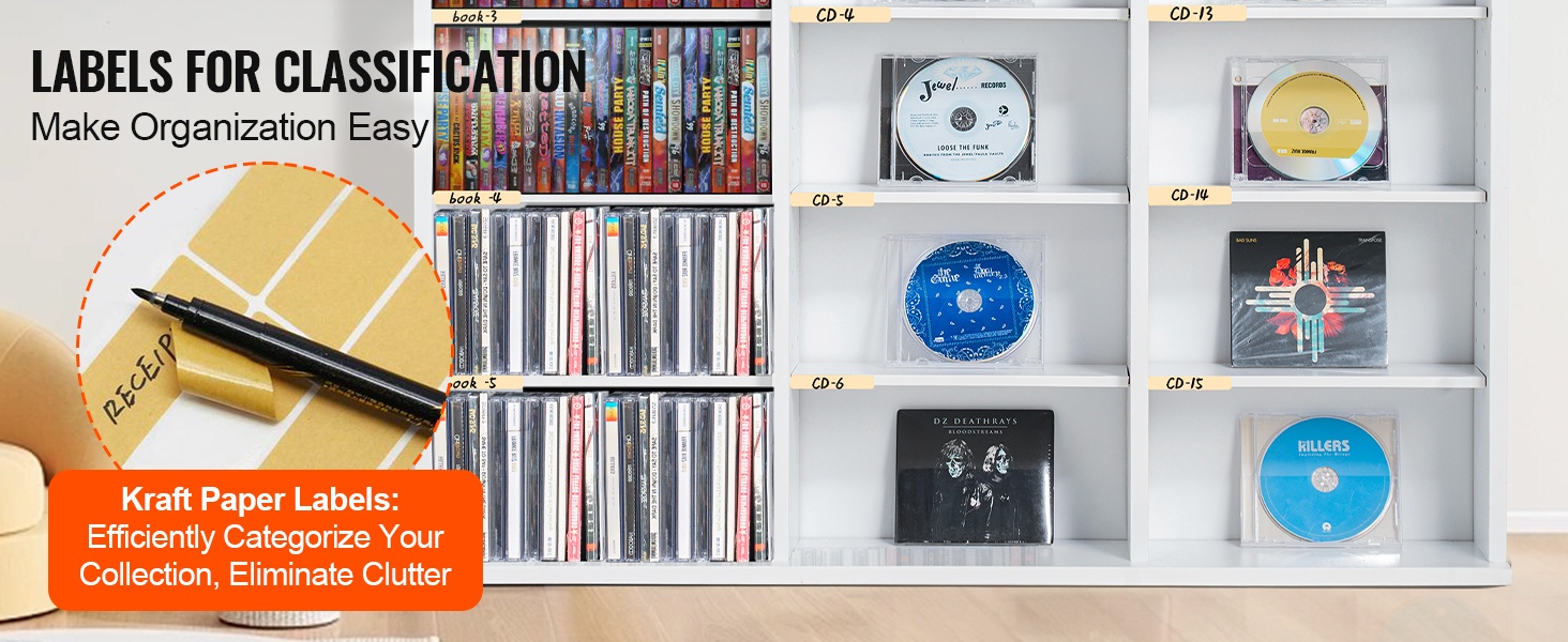 Pakkaukseen sisältyy kraft-paperiset luokittelutarrat, joiden avulla kokoelmat on helppo merkitä ja halutut levyt löytää nopeasti ilman, että tarvitsee selata läpi koko hyllyä.