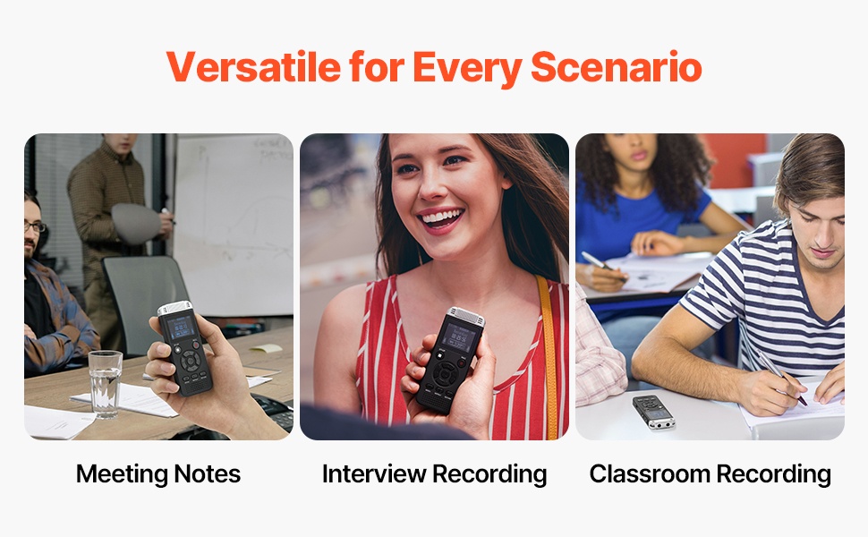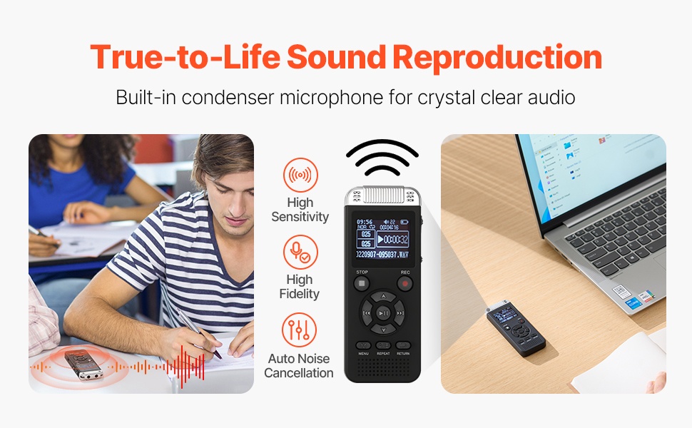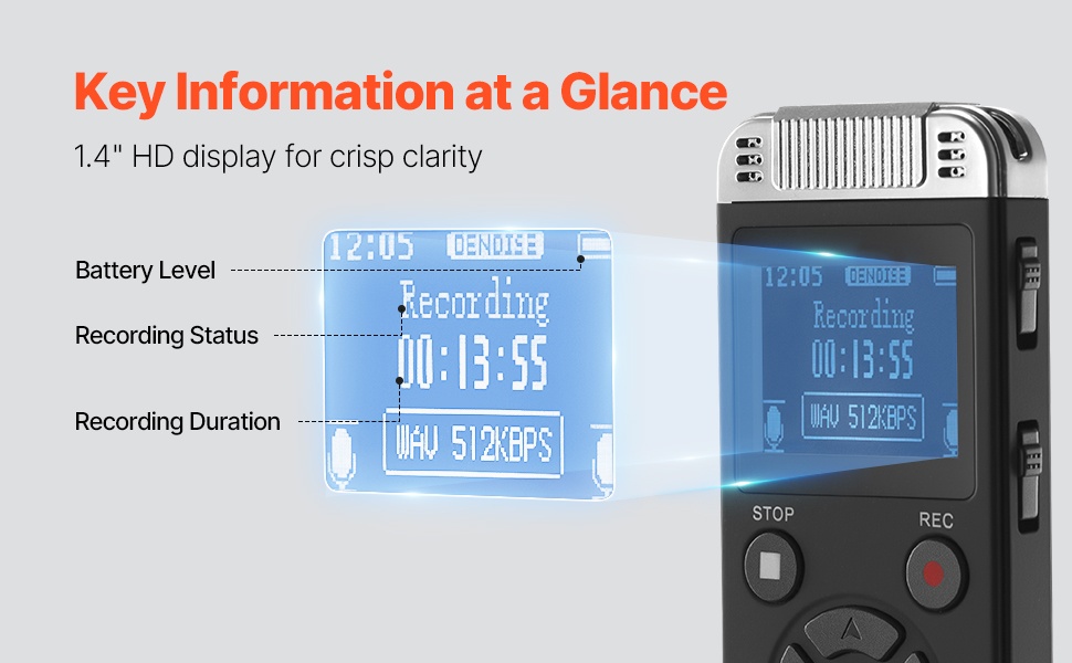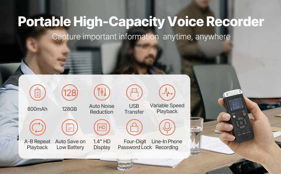 Kompakti magneetilla varustettu äänentallennin kulkee helposti mukana taskussa tai laukussa. Laitteessa on 128GB sisäinen muisti, jopa 8730 tunnin tallennustila (32Kbps) ja noin 10 tunnin yhtäjaksoinen tallennusaika 150mAh akulla. Tallenteet voi siirtää nopeasti tietokoneelle tai älypuhelimeen USB-C-yhteyden avulla.