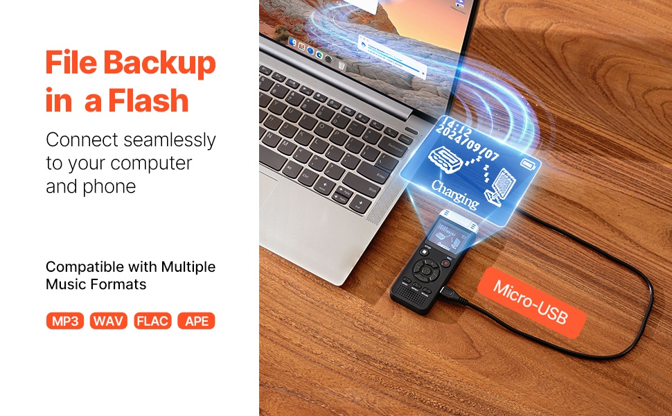 Mukana tulevan datakaapelin avulla tallenteet siirtyvät nopeasti tietokoneelle tai älypuhelimeen. Laite tukee useita ääniformaatteja, kuten MP3, WAV, FLAC ja APE. Voit myös siirtää suosikkimusiikkiasi laitteeseen ja käyttää sitä MP3-soittimena.
