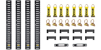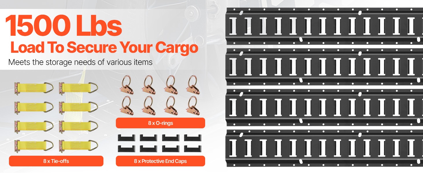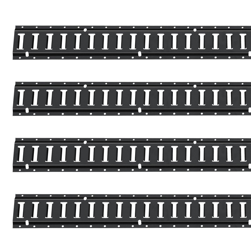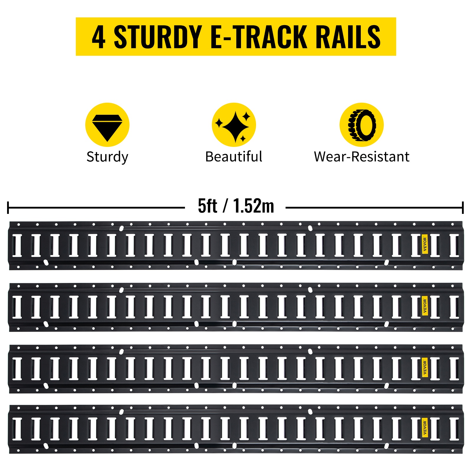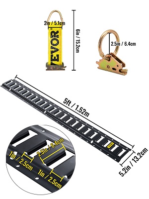 5 ft / 1.52 m pitkät E-kiskot on valmistettu teollisuuslaatuisesta teräksestä ja päällystetty mustalla pinnoitteella kulutuksen ja ruostumisen vähentämiseksi. Kiskot voidaan asentaa ajoneuvoon, lattiaan tai varaston seiniin sopivilla kiinnikkeillä.