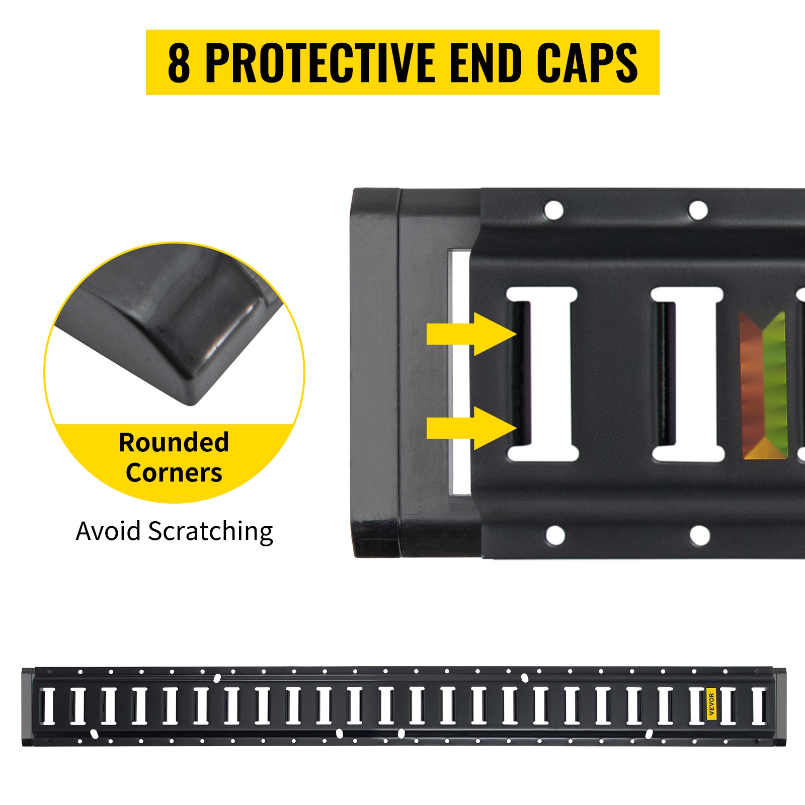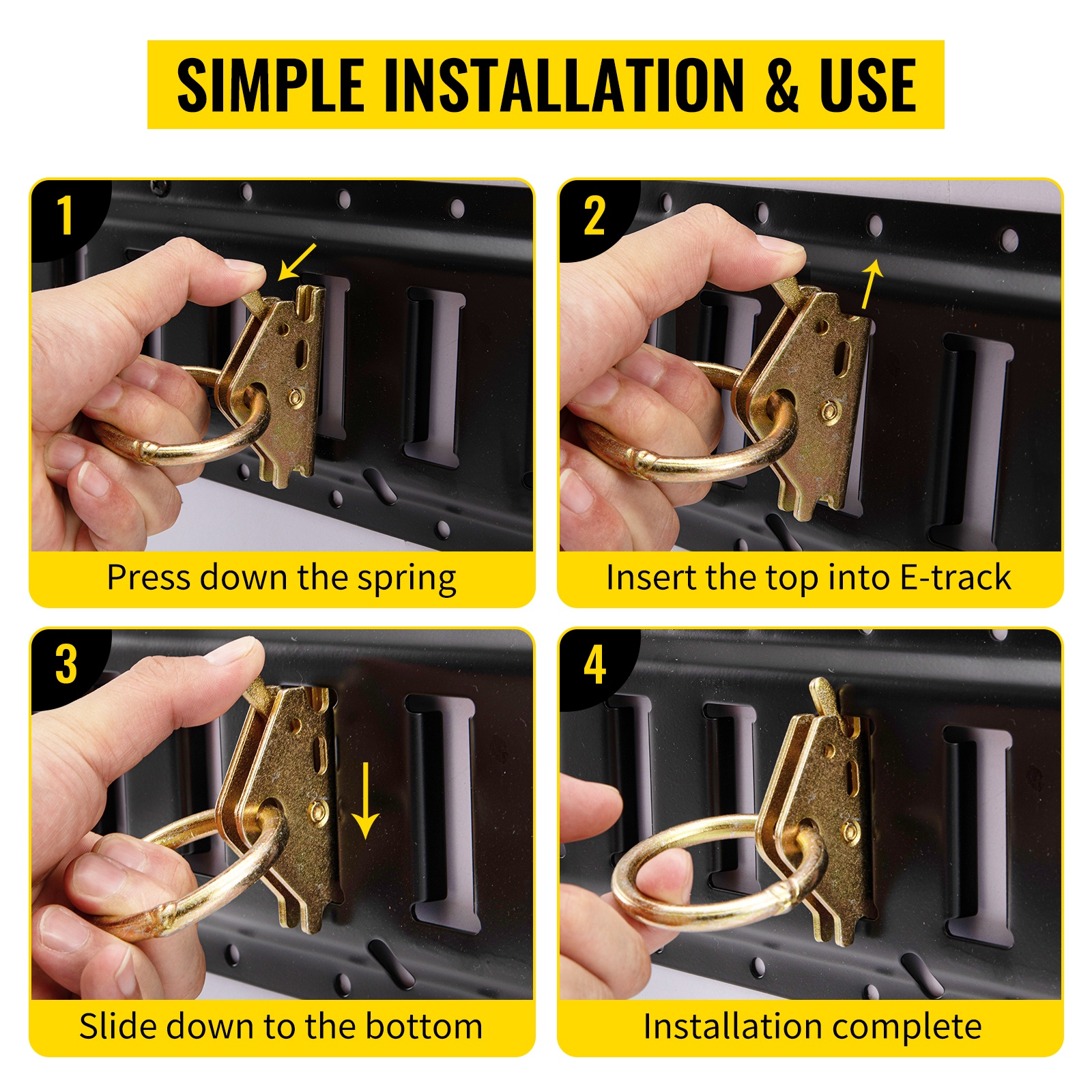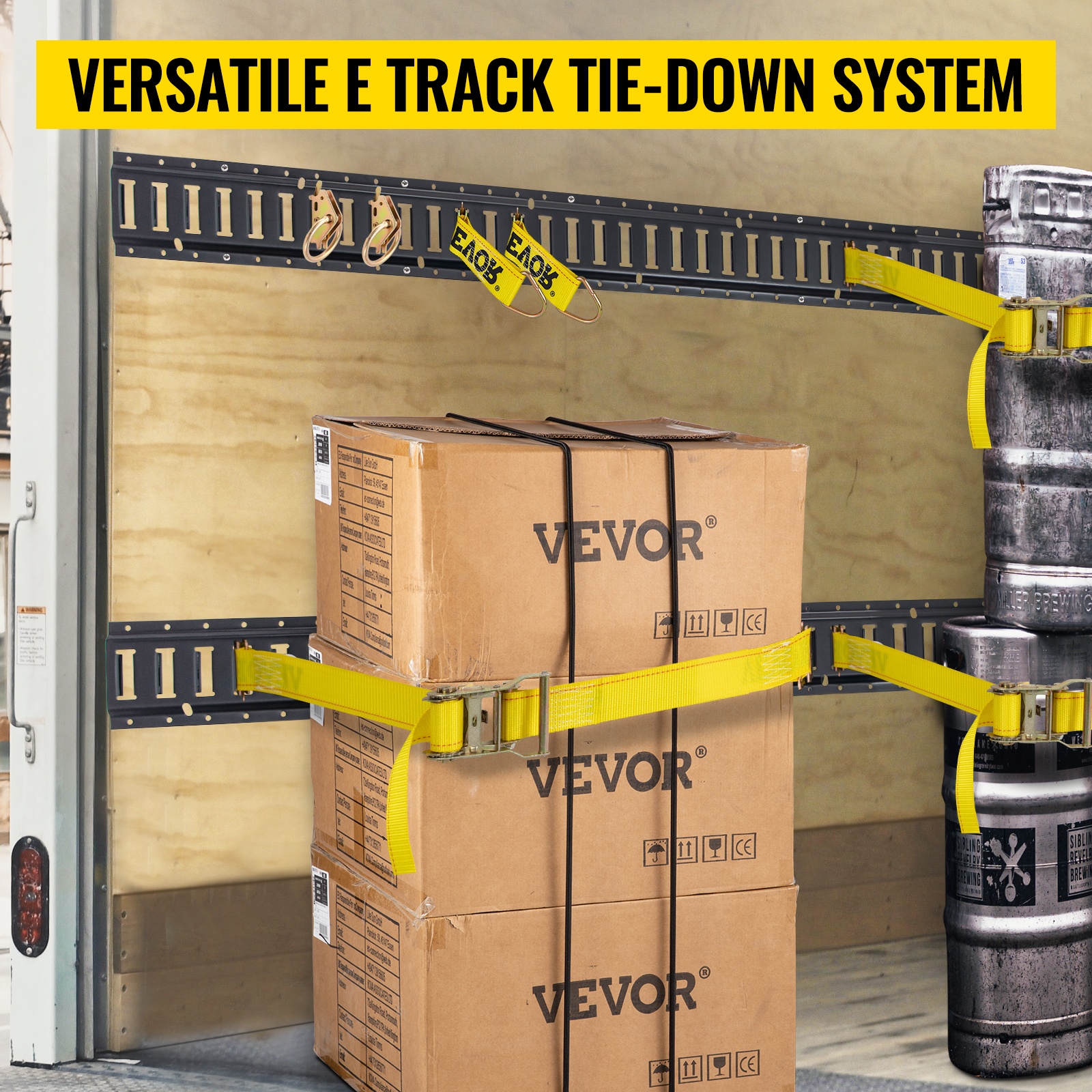 5 ft / 1.52 m pitkät E-kiskot on valmistettu teollisuuslaatuisesta teräksestä ja päällystetty mustalla pinnoitteella kulutuksen ja ruostumisen vähentämiseksi. Kiskot voidaan asentaa ajoneuvoon, lattiaan tai varaston seiniin sopivilla kiinnikkeillä.