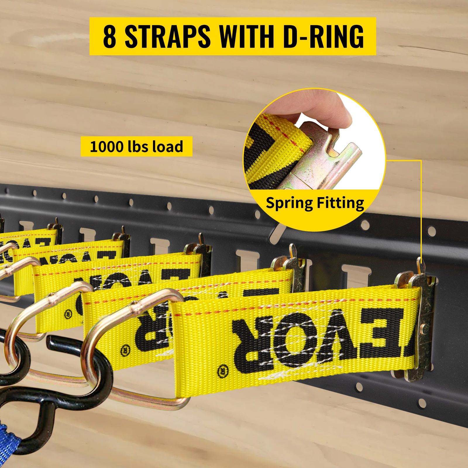 Kiinnityspäät (tie-off) valmistetaan polyesterikuitumateriaalista, jolla on hyvä veden- ja vetolujuus. Työkuormitusraja on 1000 lbs / 454 kg per kiinnityspiste. D-renkaiden avulla kuorma voidaan sitoa tai koukuttaa tukevasti paikalleen.