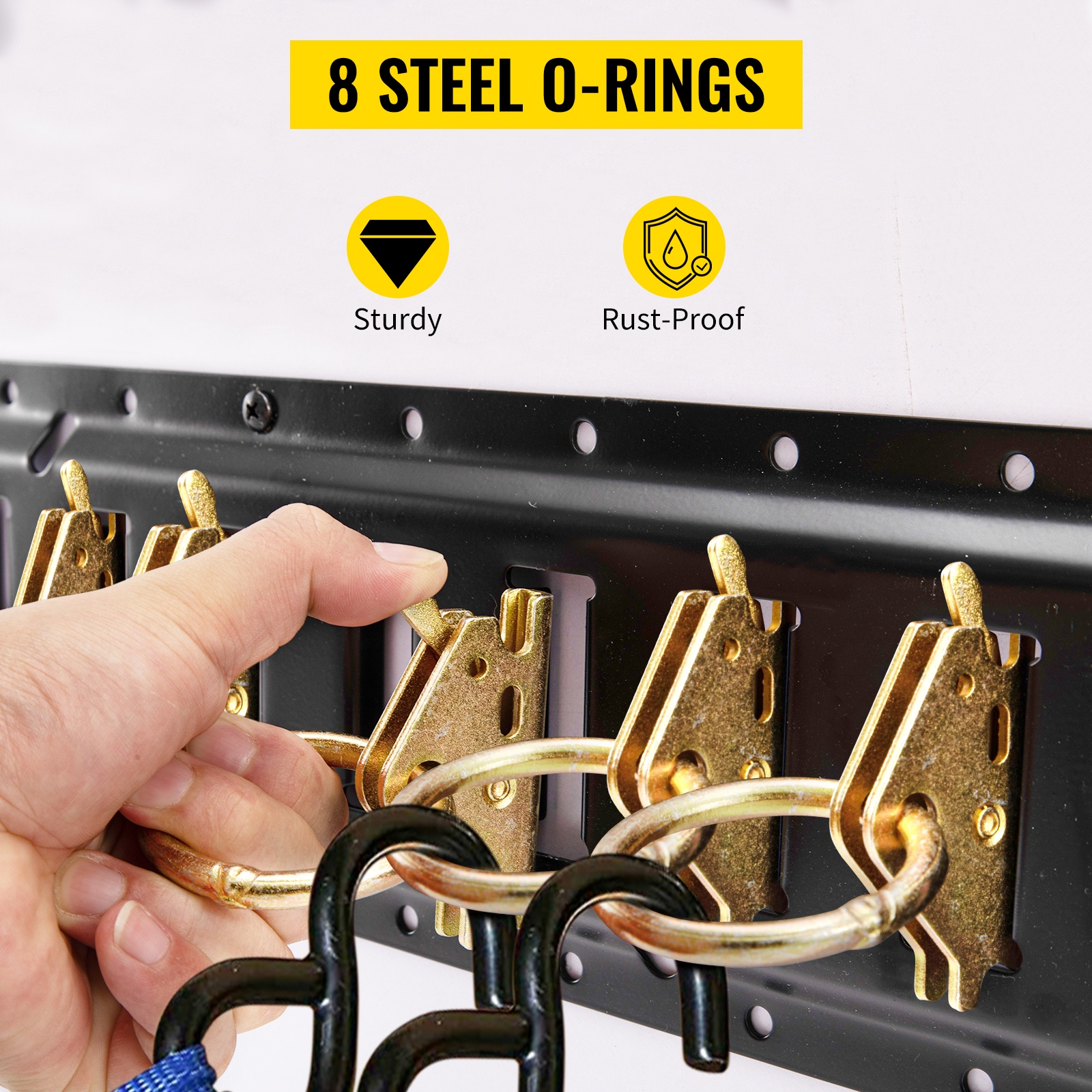 Settiin kuuluu 4 vakiomallista ja 2 raskasta käyttöä varten suunniteltua O-rengasta, joiden maksimikapasiteetti on 1500 lbs / 680 kg. O-renkaat napsautetaan E-kiskoihin ja niitä voidaan käyttää yhdessä köysien, vaijereiden, S-koukkujen ja muiden kiinnikkeiden kanssa.
