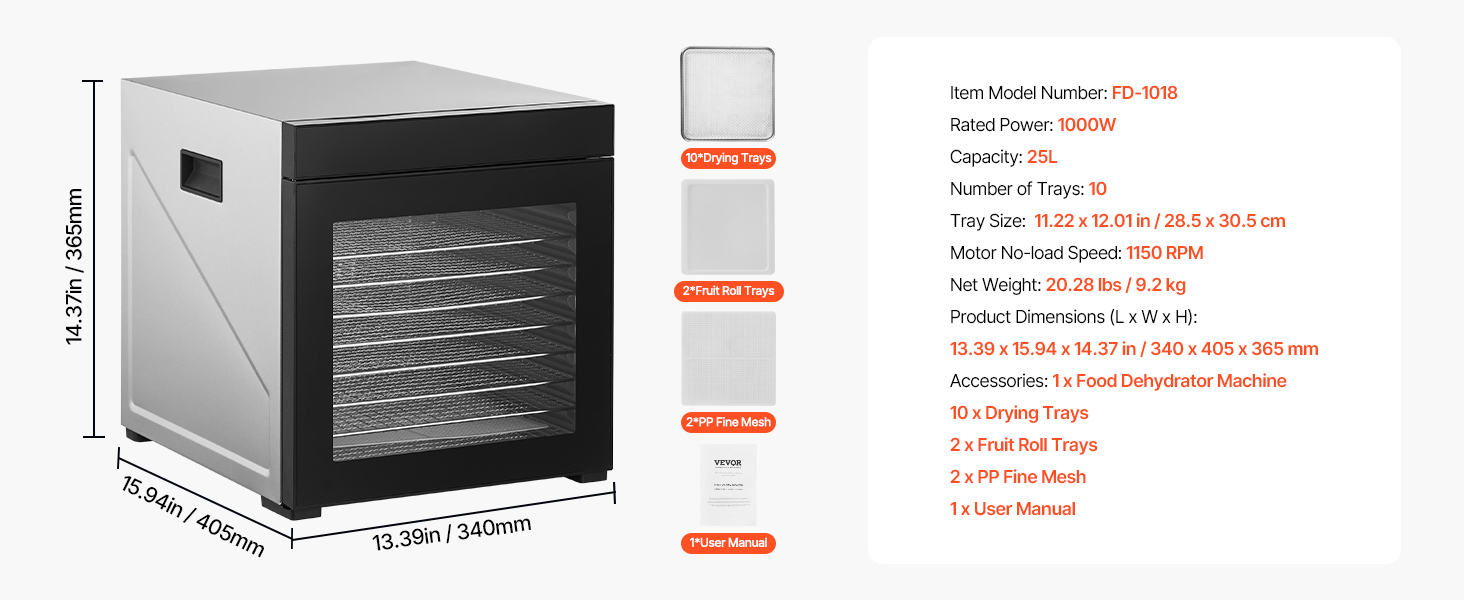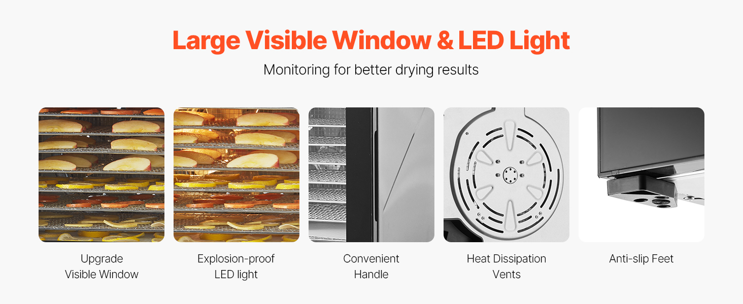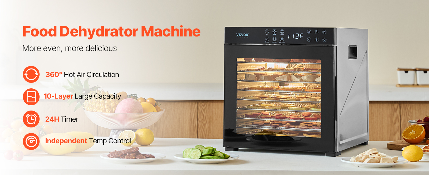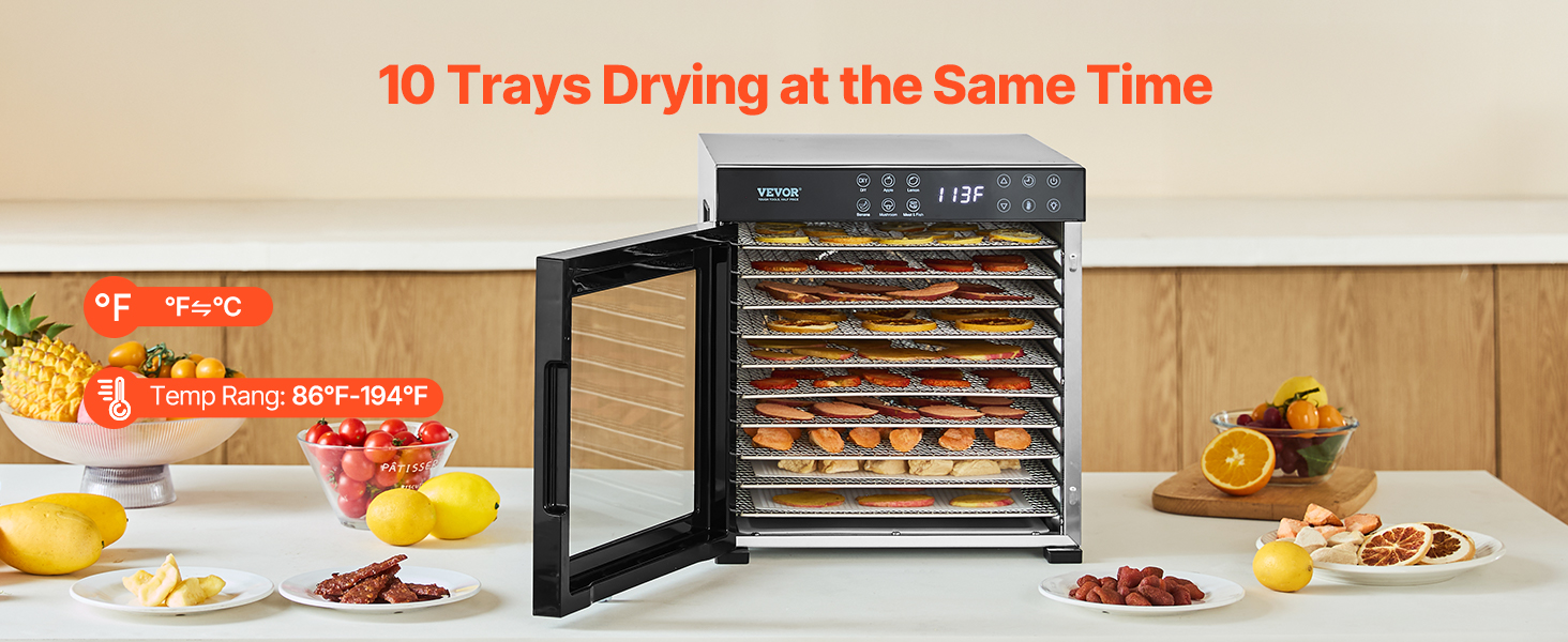 10 kerroksesta koostuva kuivauskone sopii erilaisten raaka‑aineiden kuivaamiseen: hedelmät, vihannekset, liha ja jerky, yrtit, kala ja äyriäiset, viljat sekä koirien herkut. Mukana tuleva resepti auttaa valmistamaan helposti monenlaisia kotitekoisia, kuivatettuja ruokia.