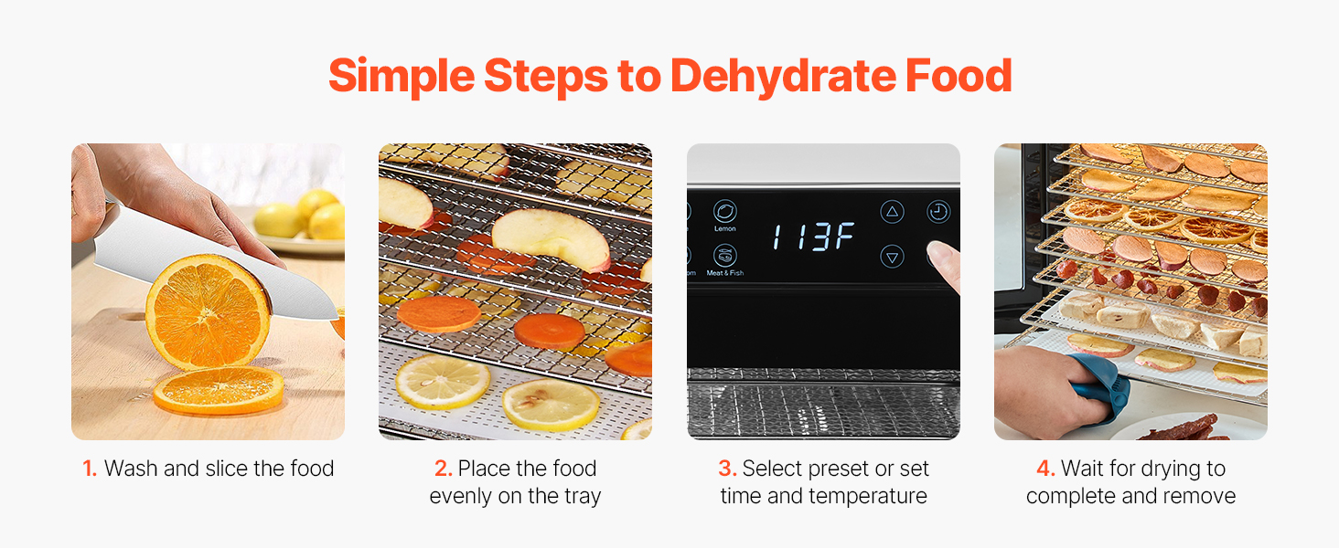 Kuivausprosessi on yksinkertainen. Parhaan tuloksen saat valitsemalla mehukkaita, laadukkaita hedelmiä ja vihanneksia. Poista pilaantuneet, ylikypsät tai raakat yksilöt ennen kuivausta, jotta lopputulos on tasalaatuinen ja maukas.