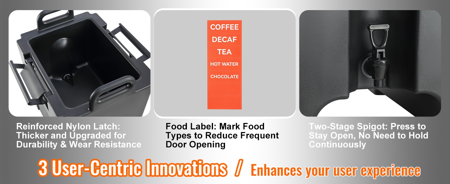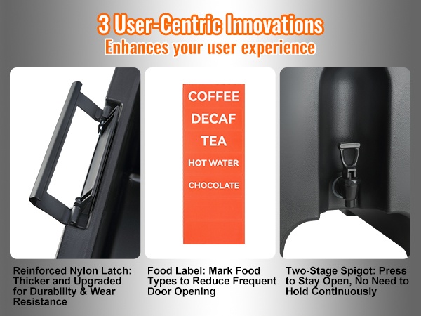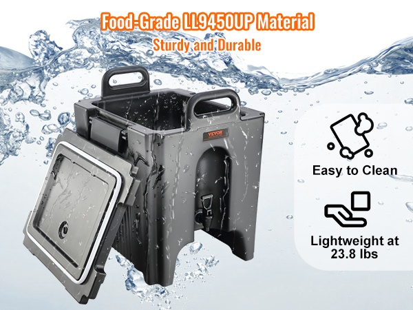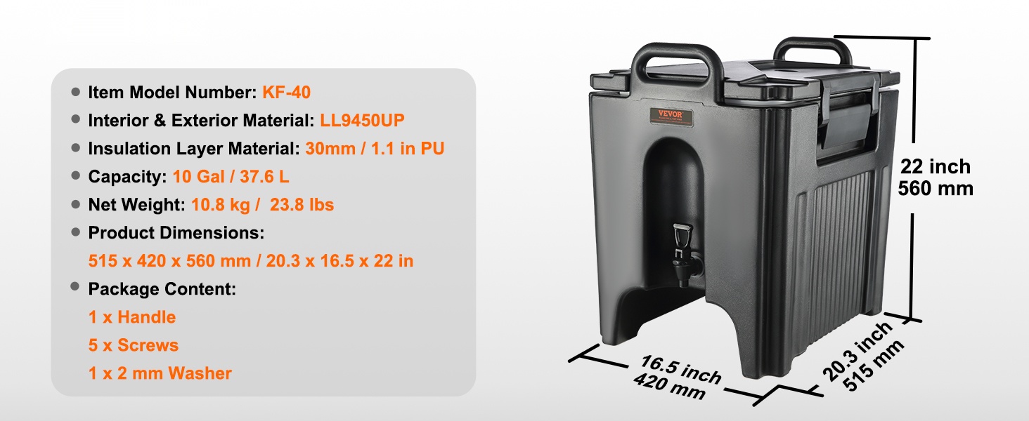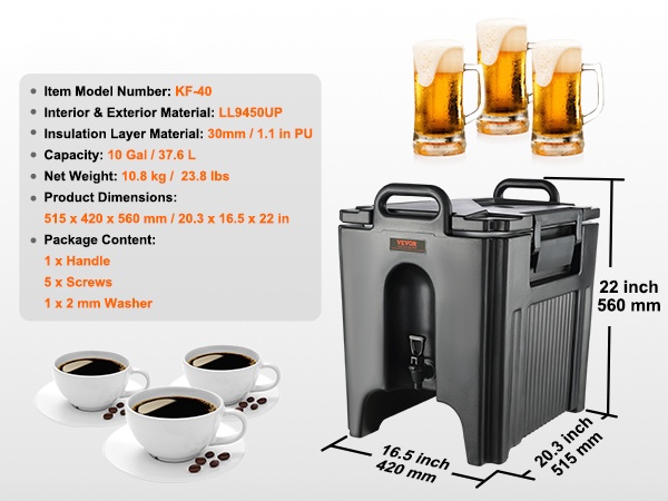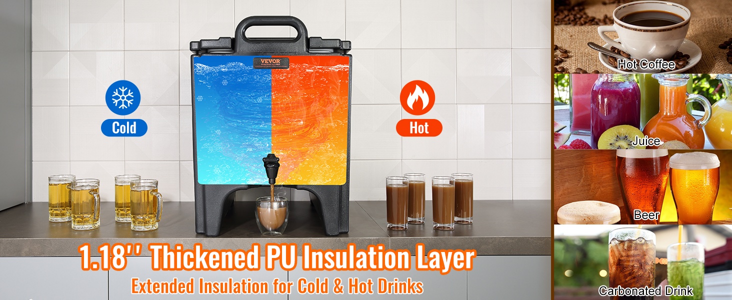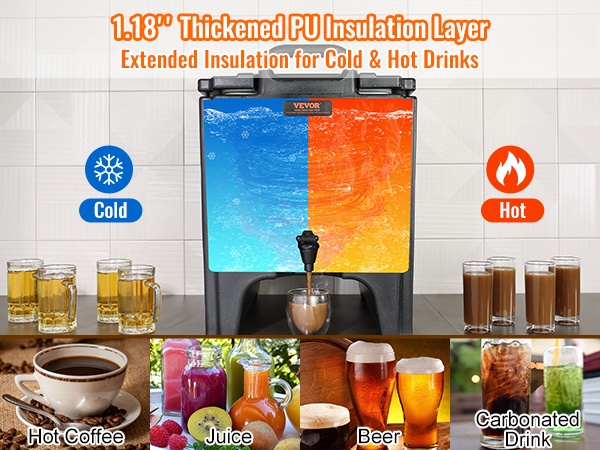 Olipa kyse mehuista, kahvista, maidosta tai teestä, tämä 5 gallon (18.9 L) juoma-annostelija soveltuu sekä kuumille että kylmille juomille. Sisä- ja ulkopinta on valmistettu LDPE-muovista, ja välissä on 23 mm PU-eristekerros, joka pitää juomat oikeassa lämpötilassa yli 10 tunnin ajan ilman sähköä.