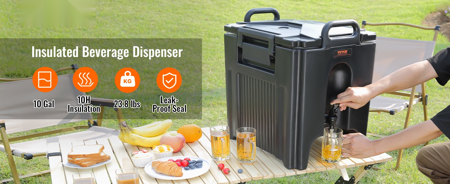 Tämä eristetty juoma-annostelija soveltuu sekä kuumille että kylmille juomille, kuten mehulle, kahville, maidolle ja teelle. Kaksinkertainen ruostumattomasta teräksestä valmistettu rakenne ja 22 mm paksu PU-eriste pitävät juomat tarjoilulämpötilassa pitkään ilman sähköä. Tilavuus 2.4 gallonaa / 9.2 litraa sopii hyvin ravintoloihin, kahviloihin, tapahtumiin ja kotikäyttöön.