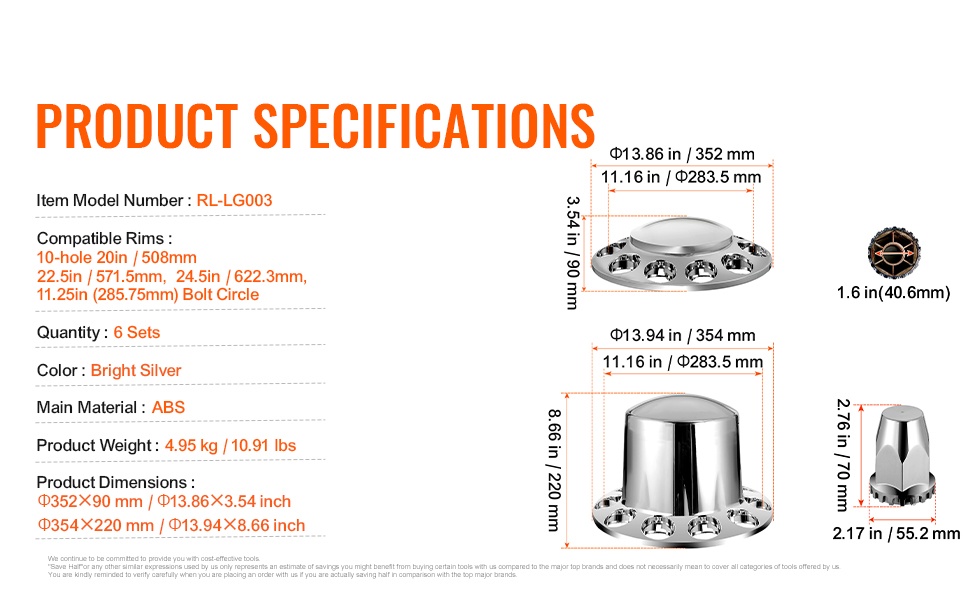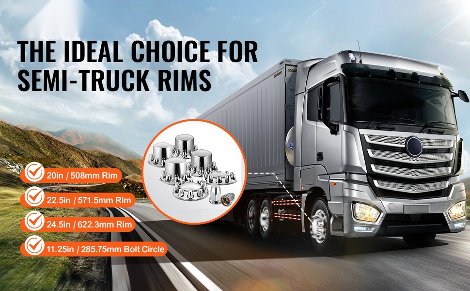 - Yhteensopiva 10-reikäisten vanteiden kanssa (20 tuumaa / 508mm, 22.5 tuumaa / 571.5mm, 24.5 tuumaa / 622.3mm, 11.25 tuumaa (285.75mm) pulttijako)