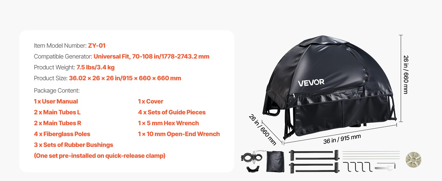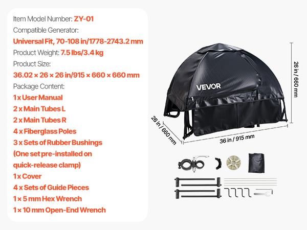 Yleismallinen generaattorin suojapeite, joka suojaa laitetta sateelta, lumelta ja auringolta käytön aikana. Peite sopii useimpiin siirrettäviin generaattoreihin, joiden ympärysmitta on 70–108 in/1778–2743.2 mm, ja se on mitoitettu generaattoreille, joiden mitat ovat 36.02 x 26 x 26 in/915 x 660 x 660 mm.