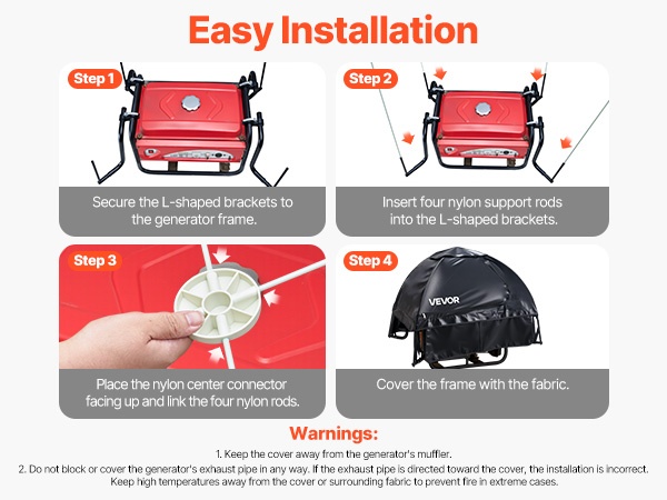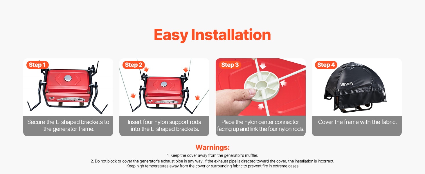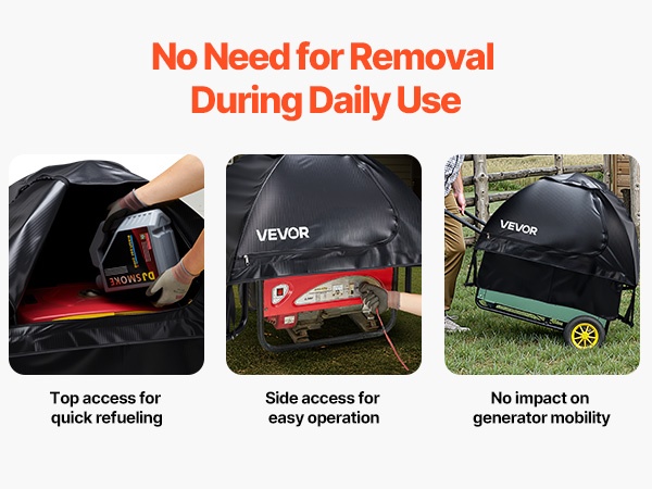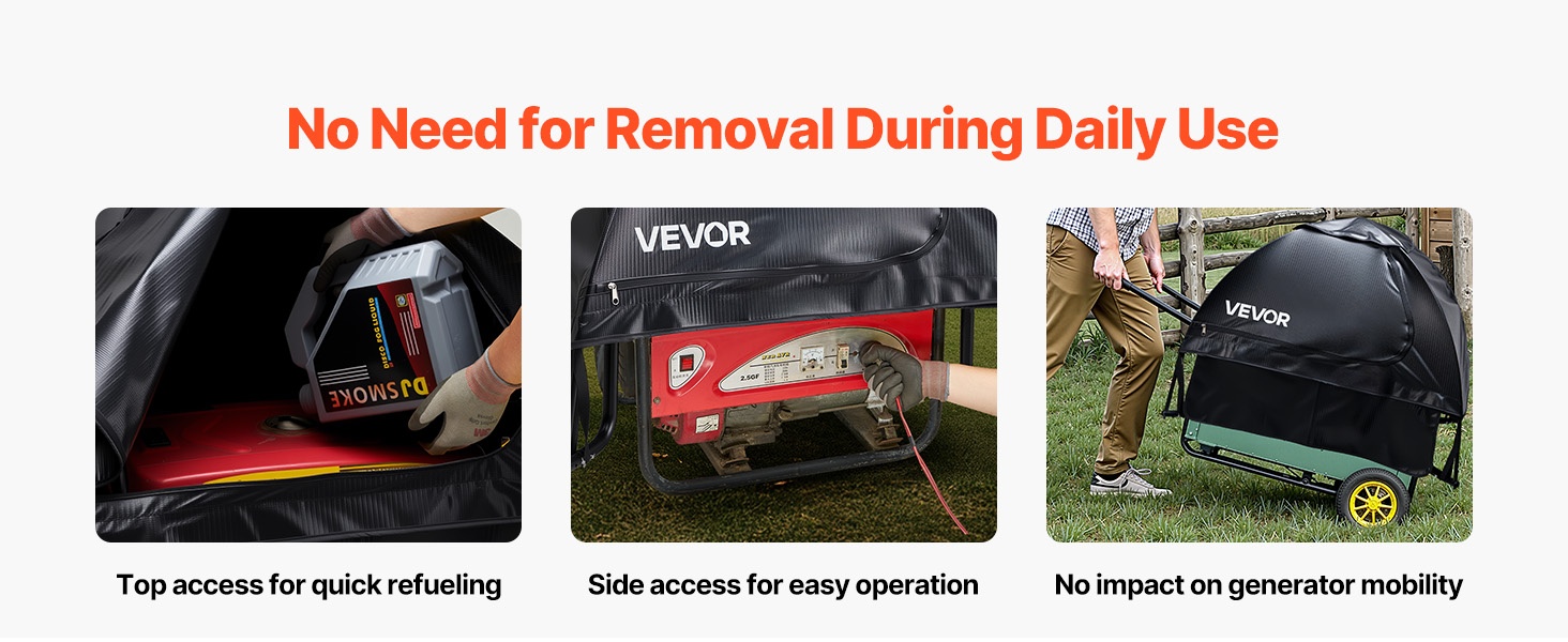 Jokainen osa on mitoitettu istumaan tiiviisti ja vakaasti generaattorin ympärille, jotta peite ei siirry tai luiskahda pois paikaltaan käytön aikana. Yläosan läppä avautuu tankkausta varten, ja sivupaneelit mahdollistavat nopean pääsyn virranohjaimiin irrottamatta koko peitettä. Tämä helpottaa generaattorin käyttöä eri työympäristöissä.