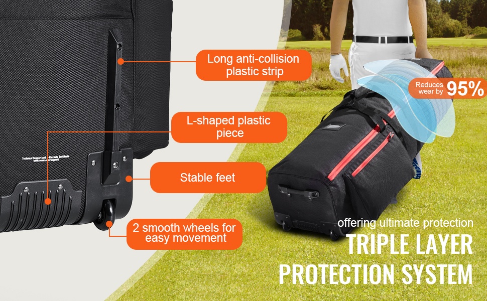 Taitettava golf-matkalaukku on suunniteltu kantamaan useampia mailoja ja varusteita, joten se voi olla painava täytenä. Siksi laukussa on pyörät ja kätevä kahva, joiden avulla sitä on helppo vetää. Optimoidut pyörät ja tukeva kumipohja tekevät kuljettamisesta sujuvaa ja pitkäikäistä.