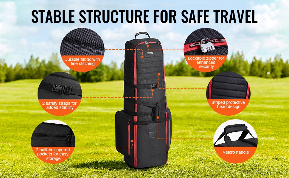 Laukku on valmistettu säänkestävästä 1000D nailonista, joka tarjoaa hyvän iskunkestävyyden ja vedenpitävyyden. Kaksi suurta sivutaskua ulkopuolella lisäävät säilytystilaa, ja niiden vetoketjut ovat lukittavissa. Turvahihnat sisällä pitävät mailat tukevasti paikallaan kuljetuksen ajan.