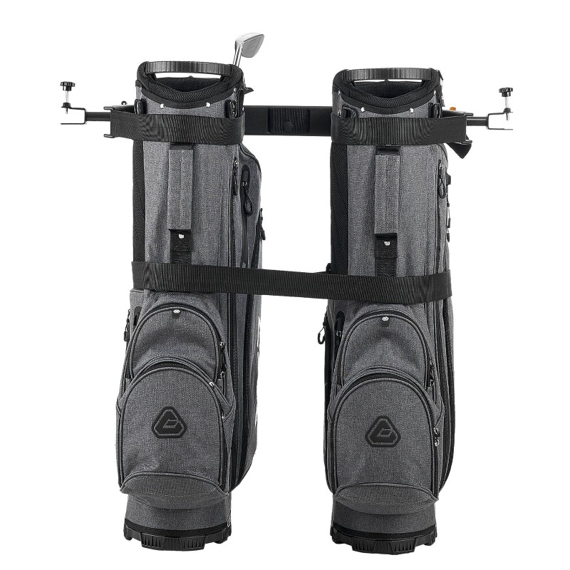 Monipuolinen ja kestävä golfkärryn bäginpidike, joka kiinnittyy takaistuimeen ilman porausta. Säädettävä leveys ja tukevat hihnat pitävät bägejä turvallisesti paikallaan myös epätasaisessa maastossa.