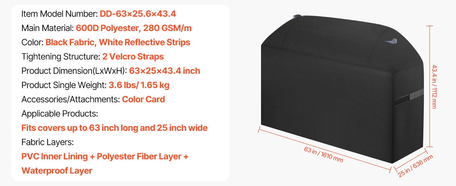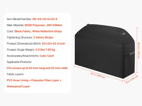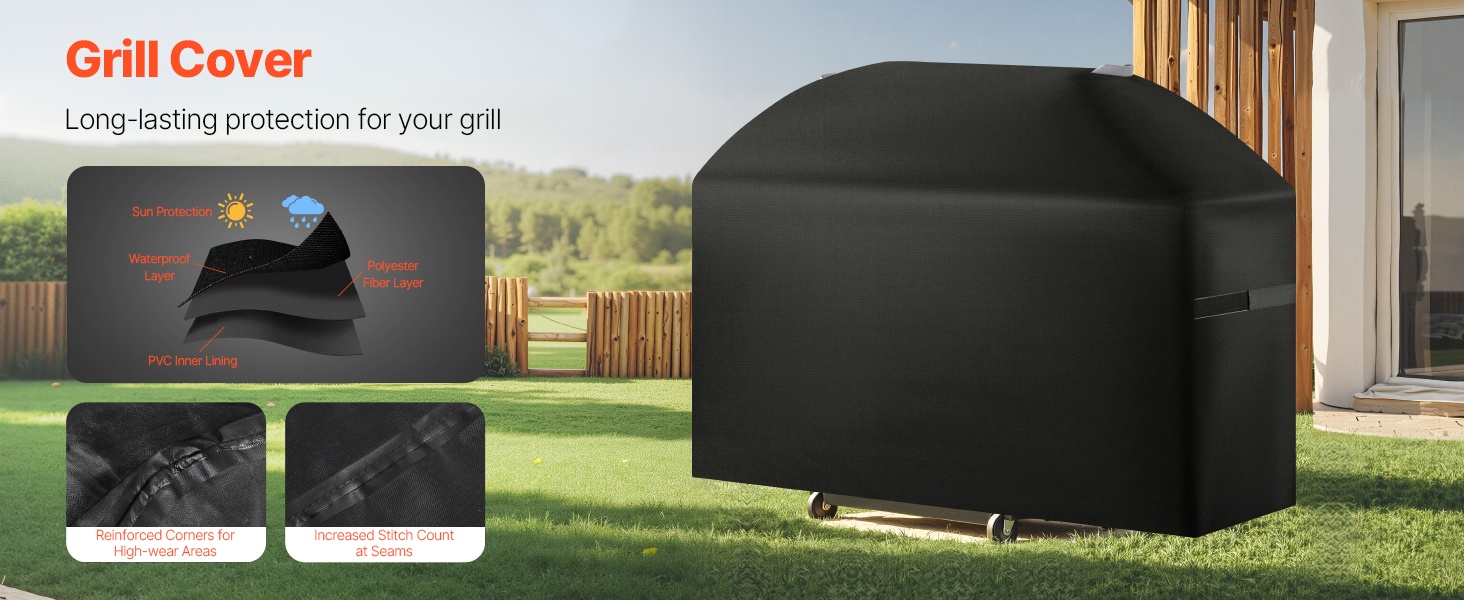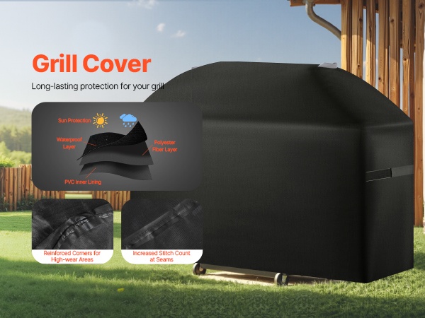 Suojus on valmistettu 3 kerroksesta: PVC-vuorauksesta, polyesterikuitukerroksesta ja vedenpitävästä kerroksesta. Tämä rakenne parantaa vedenpitävyyttä ja suojaa grillin pintaa. Neljä kulmaa on vahvistettu hankausta ja kulumista vastaan, ja tiheä tikkauksien väli lisää kestävyyttä ja vedenpitävyyttä.