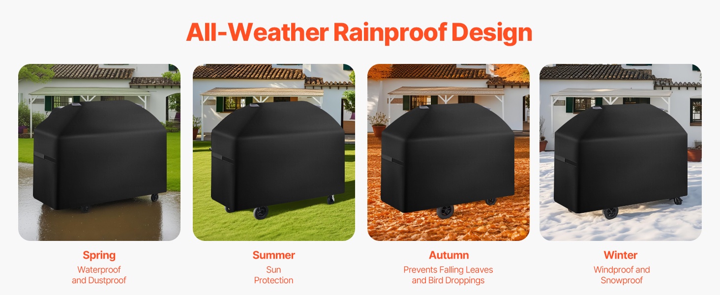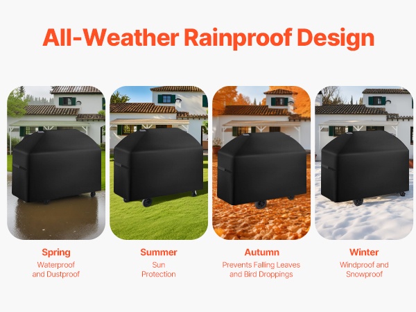 Tämä grillisuojus suojaa ulkogrillisi sateelta, lialta ja UV-säteilyltä ympäri vuoden. Kolmikerroksinen rakenne ja kulmien vahvistukset parantavat kestävyyttä ja pidentävät grillin käyttöikää.