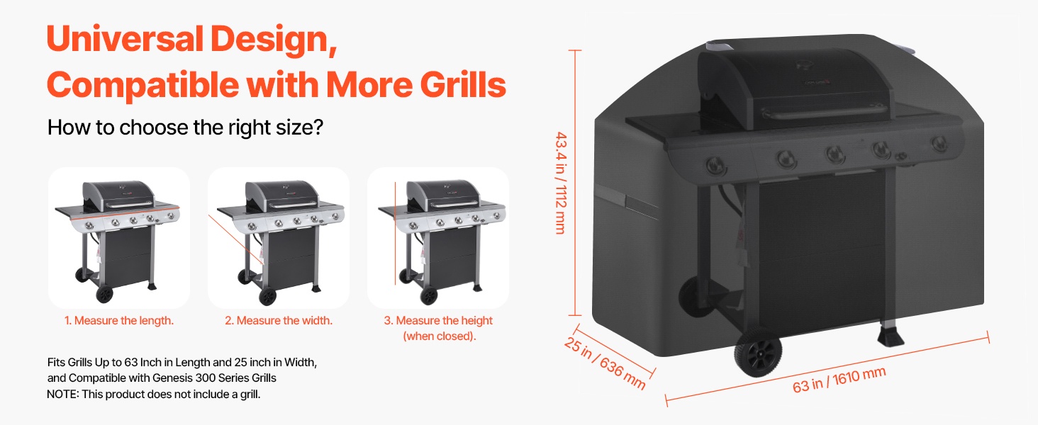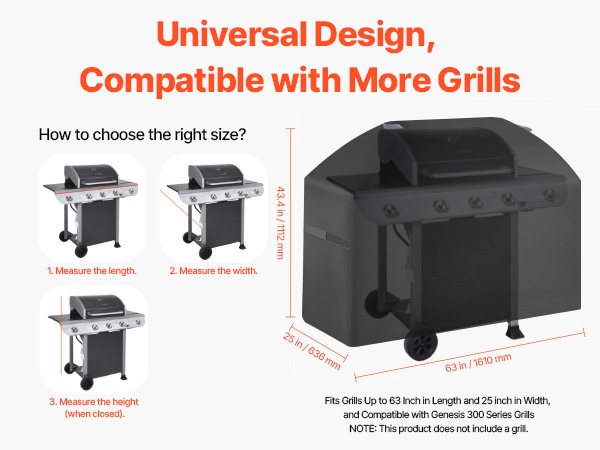 - Sopii grilleihin, joiden pituus on enintään 63 tuumaa ja leveys enintään 25 tuumaa (esim. Genesis 300 -sarjan grillit)