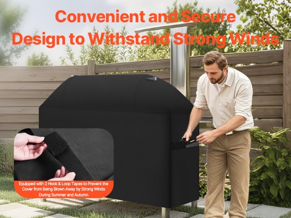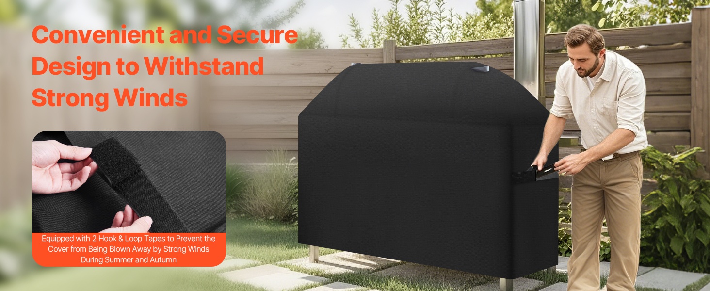 Voimakkaat tuulenpuuskat eivät helposti irrota suojusta. Kahdet tarranauhahihnat helpottavat suojusten nopeaa kiristämistä ja auttavat pitämään sen paikoillaan grillin ympärillä.