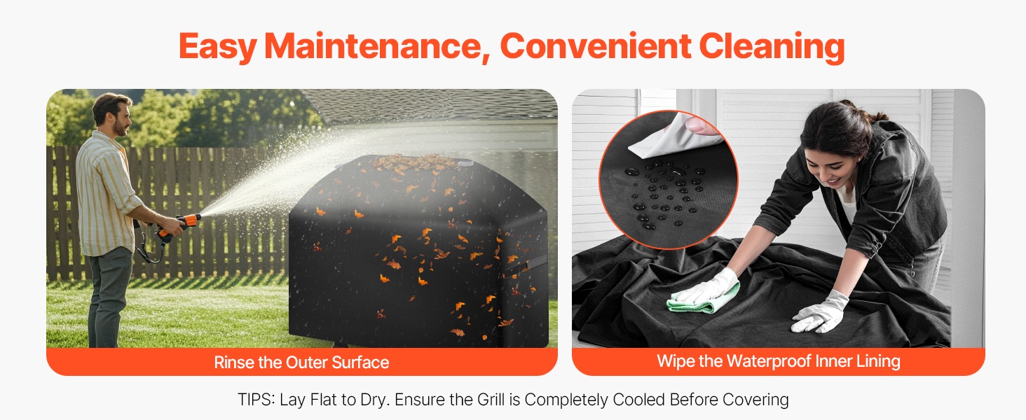 Suojusta on helppo hoitaa: huuhtele ulkopinta ja pyyhi vedenpitävä sisävuori puhtaaksi. Anna kuivua tasolla ja suojus on taas valmis käyttöön. Huomio: anna grillin jäähtyä kokonaan ennen kuin asetat suojuksen paikalleen, jotta materiaalin käyttöikä säilyy mahdollisimman pitkänä.
