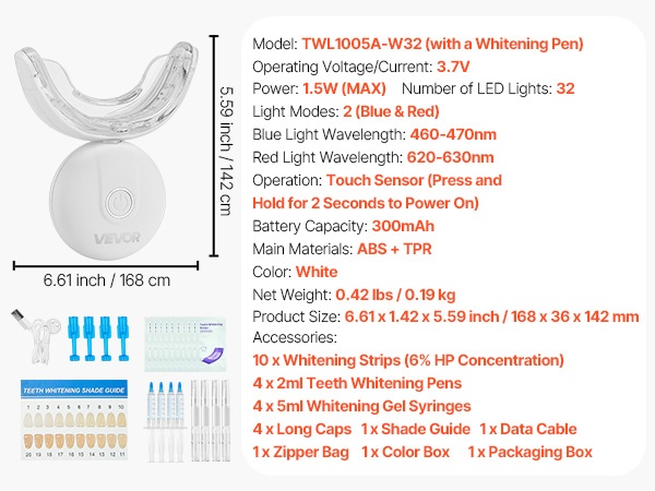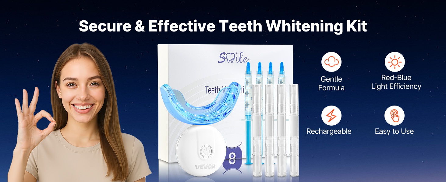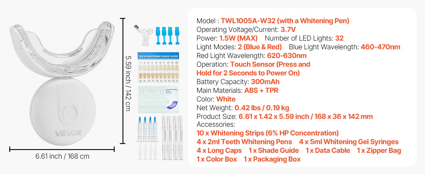 Langaton ja helposti mukana kulkeva hampaiden valkaisusetti, jossa on LED-valo, 32 LED-kiihdytinvaloa, valkaisugeeli, herkkyyttä vähentävä geeli ja U-muotoinen suukappale. Auttaa vaalentamaan sitkeitä värjäymiä hellävaraisesti kotona ilman monimutkaisia rutiineja.
