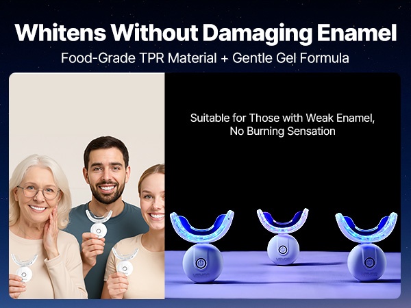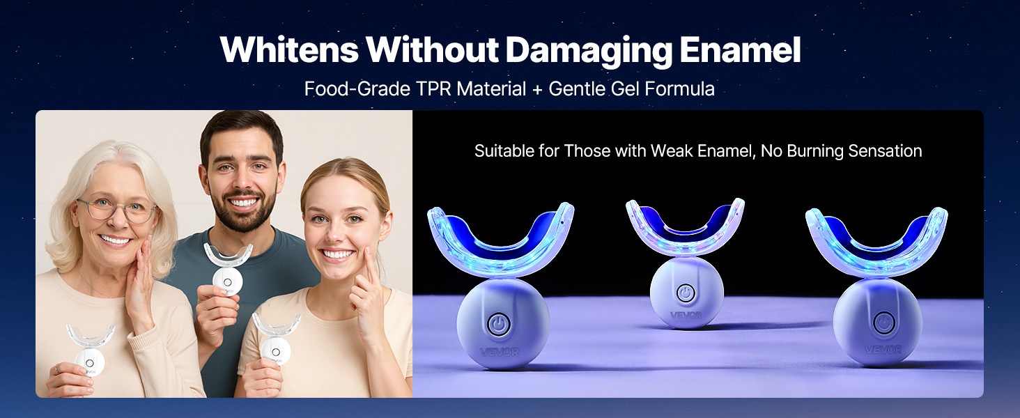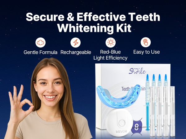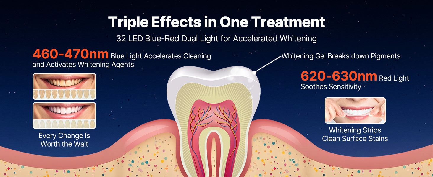 Punaiset ja siniset LED-valot toimivat yhdessä nopeuttaen valkaisuprosessia. Yhdistettynä mietoon geelikaavaan tämä LED-hampaiden valkaisusetti auttaa vähentämään värjäytymiä ja kellastumia ilman voimakkaita liuskoja tai epämiellyttäviä käsittelyjä.
