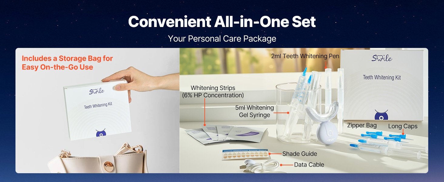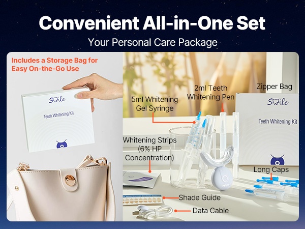 Hampaiden valkaisulaite toimitetaan täydellisen tarvikekokonaisuuden ja matkakassin kanssa. Kevyt ja pienikokoinen – mahtuu helposti pesutarvikepussiin tai matkalaukkuun, joten valkaisurutiinia on helppo jatkaa myös matkoilla.