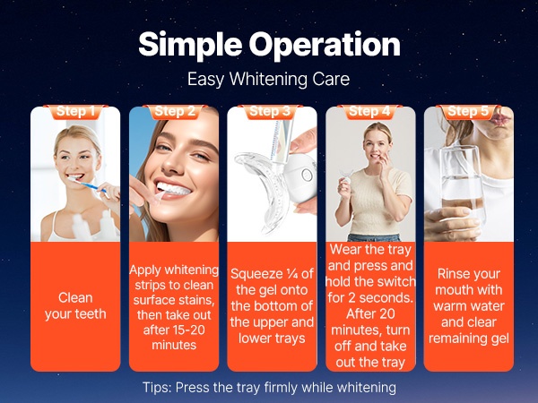 Selkeä 5-vaiheinen rutiini tekee käytöstä yksinkertaista. Pitkä painallus käynnistää valkaisulaitteen, ja voit aloittaa hymyä kirkastavan käsittelyn kotona ilman hammaslääkärikäyntiä.