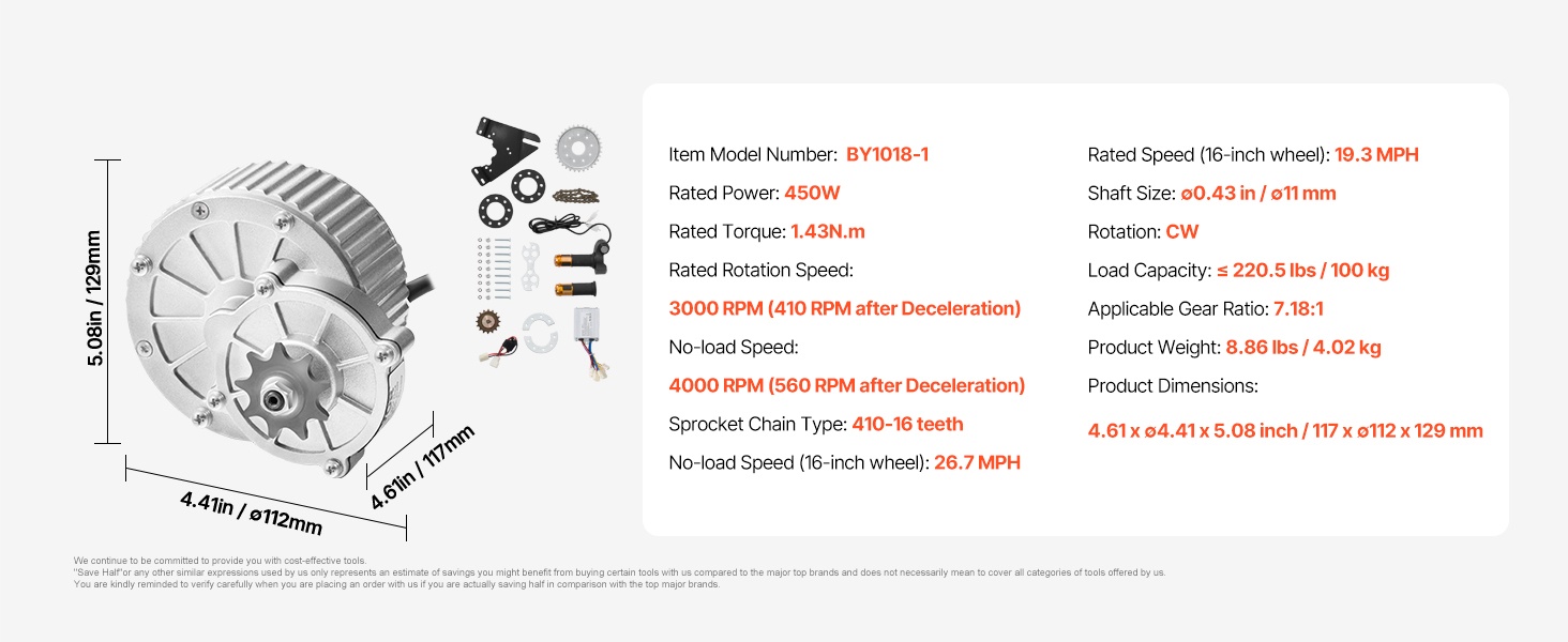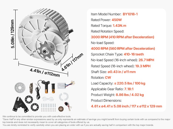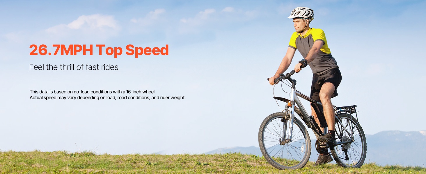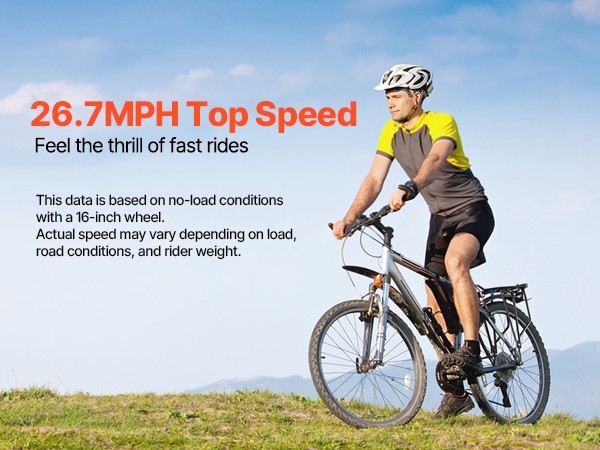 Tyhjäkäynnillä moottori voi saavuttaa jopa 46 MPH nopeuden. Huomioi, että tämä enimmäisnopeus on mitattu ilman kuormaa 16-tuumaisella renkaalla – todellinen nopeus vaihtelee kuorman, tienpinnan ja kuljettajan painon mukaan.