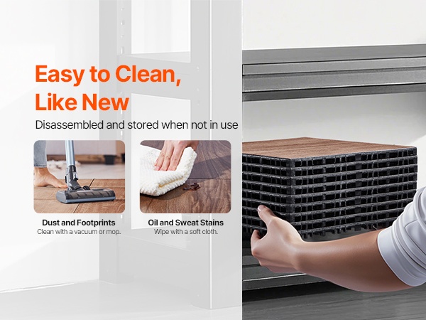 Puhdistus ja ylläpito ovat vaivattomia. Pyyhkäise laatat käytön jälkeen puhtaaksi ja anna niiden kuivua. Näin pinta pysyy siistinä ja käyttöikä pitenee. Irrotettavat, toisiinsa lukittuvat laatat on myös helppo purkaa ja varastoida pienempään tilaan.
