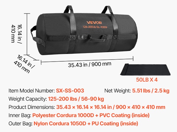 Tämä kestävä harjoitushiekkasäkki on monipuolinen väline voima- ja kuntotreeniin. Sisäpussi on polyesteriä (Cordura 1000D) PVC-pinnoitteella ja ulkopussi nylonia (Cordura 1050D). Laadukkaiden materiaalien ja tiiviin sulun ansiosta pussi on kestävä, vedenpitävä ja hiekkatiivis, ja se soveltuu hyvin monipuoliseen harjoitteluun.