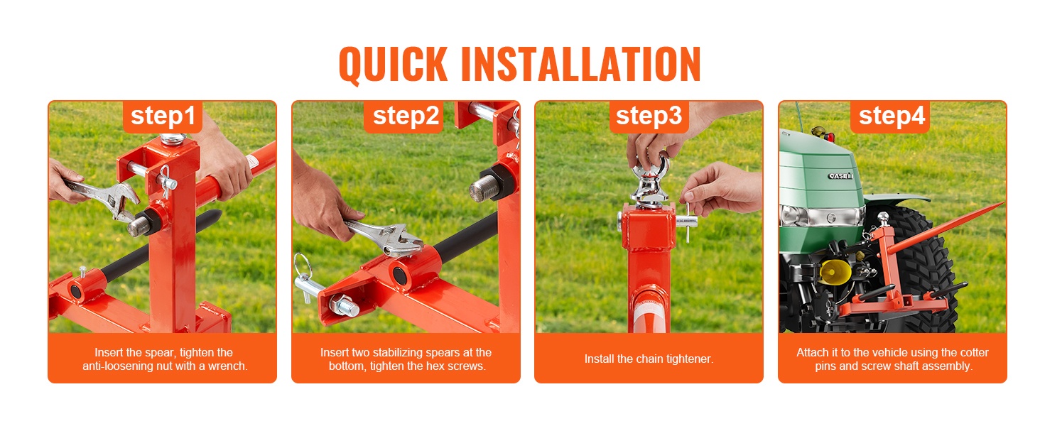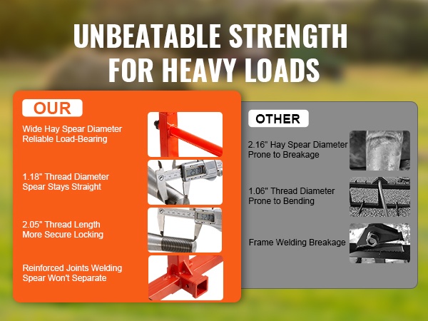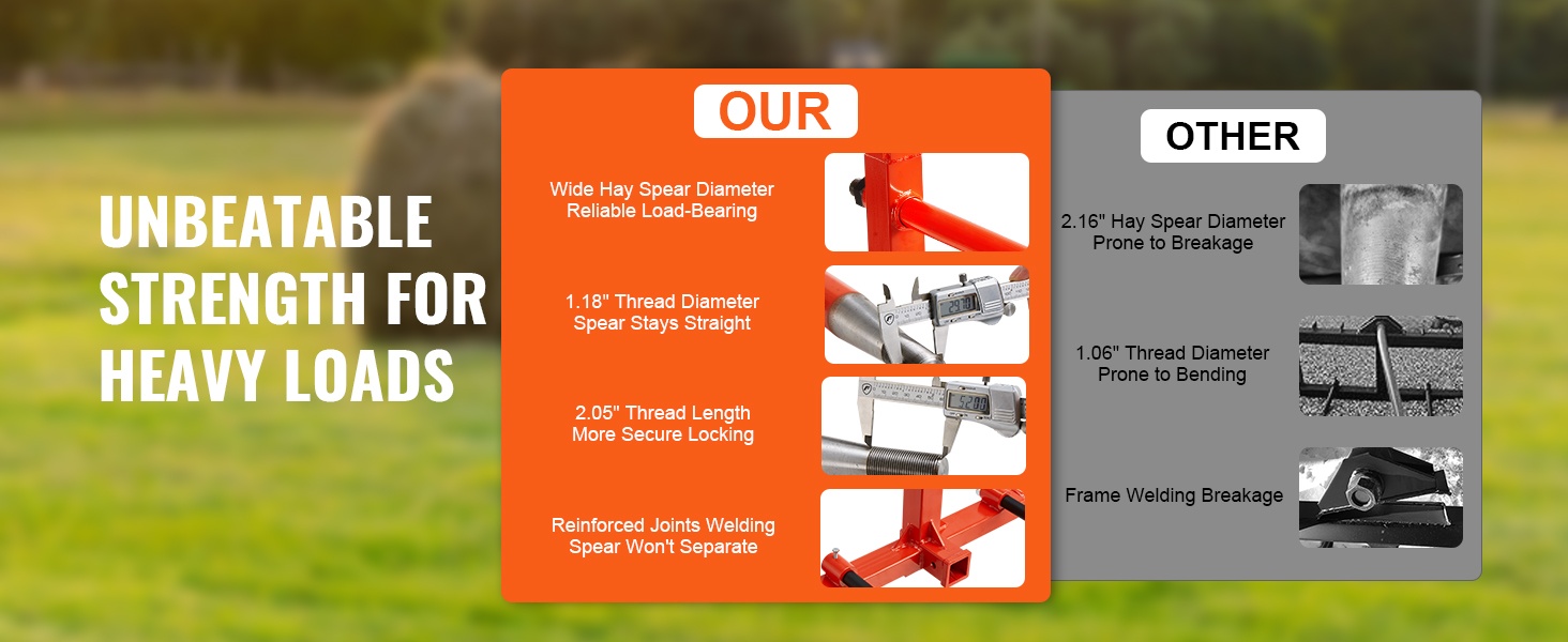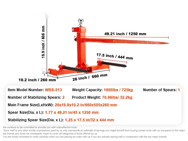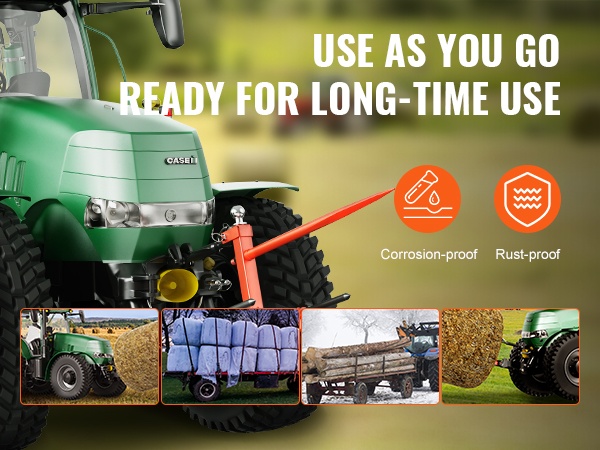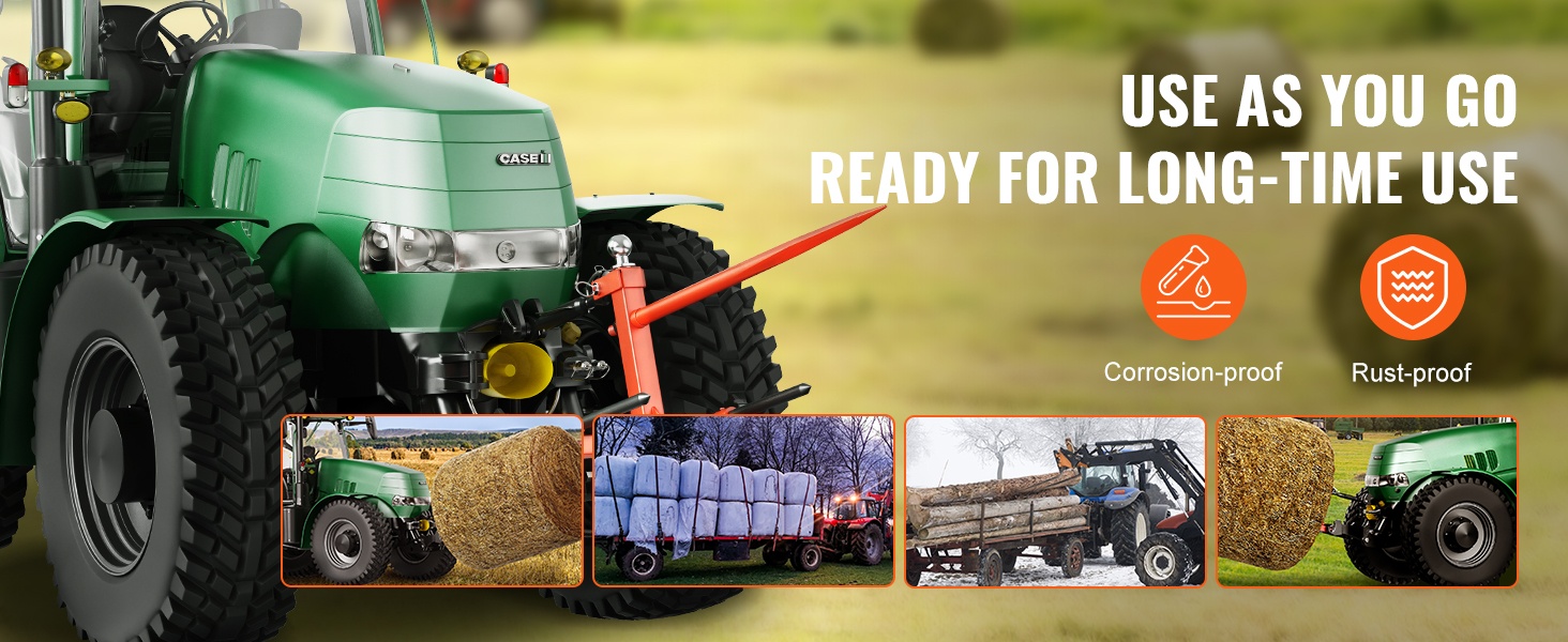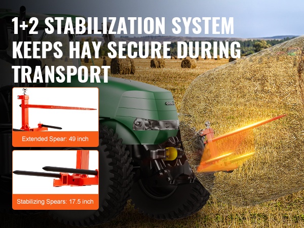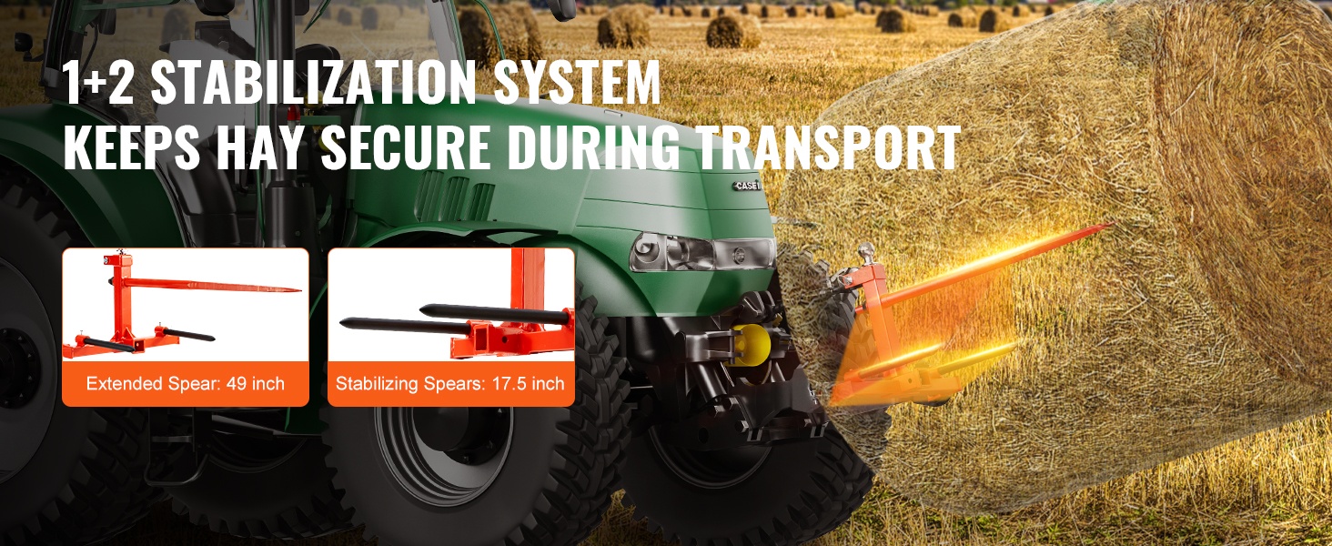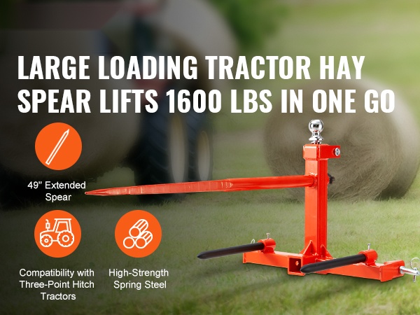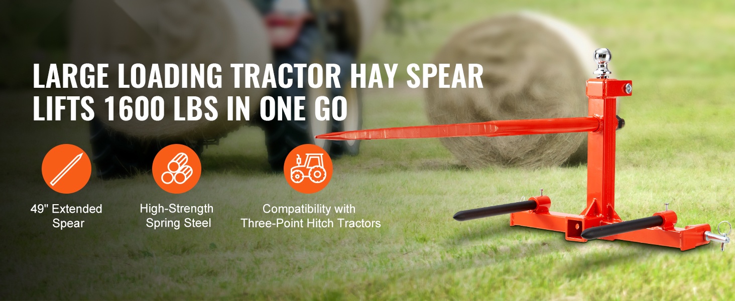 Tämä 49" heinäharkospiikki helpottaa raskaiden pyöröpaalien käsittelyä pelloilla ja työmailla. Jopa 1600 lbs/725 kg kantavuus ja vahvasta jousiteräksestä valmistettu pitkä pääpiikki tekevät suurten paalien siirtämisestä sujuvaa. Kolmipistekiinnitys sopii moniin traktoreihin, joten varusteen käyttöönotto on helppoa.