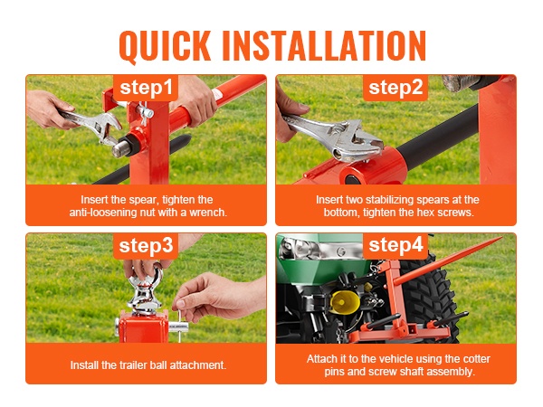 Piikit kiinnitetään neljän selkeän vaiheen avulla. Yksi pääpiikki ja kaksi tukipiikkiä, vetokuulakokoonpano sekä lukitusnastat ja ruuvit varmistavat, että kiinnitys traktoriin on tukeva ja turvallinen.