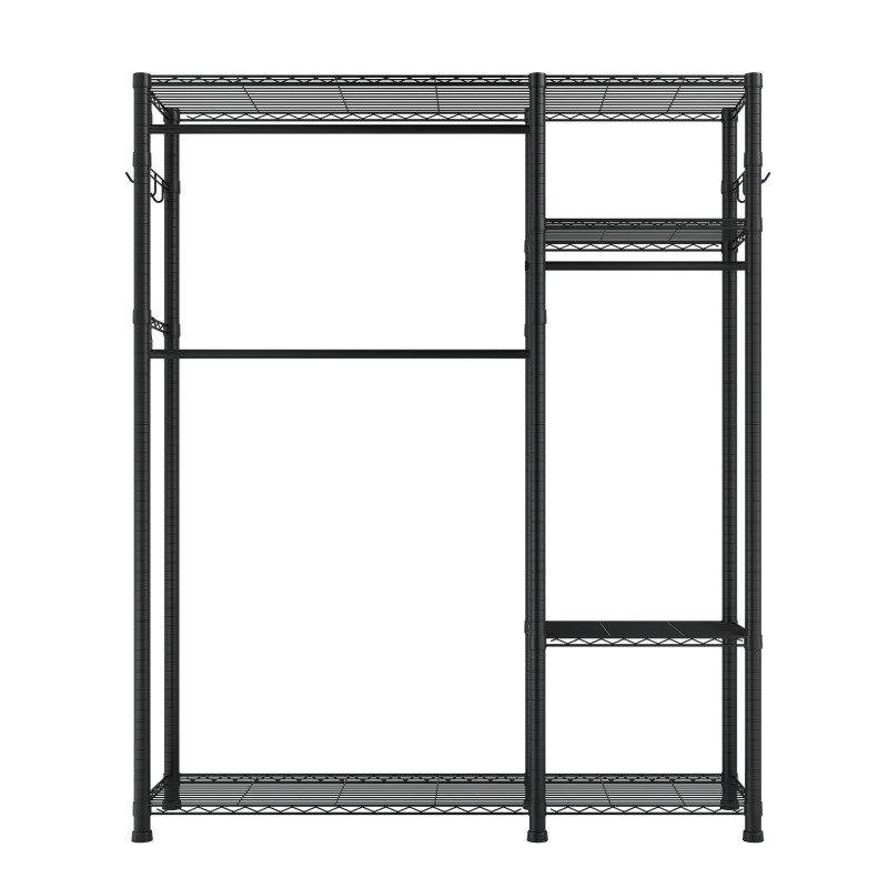 Tämä vahvarakenteinen vaateteline tarjoaa runsaasti säilytystilaa ja on valmistettu kestävästä hiiliteräksestä. Korkeussäädettävät hyllyt mukautuvat erikokoisille vaatteille ja tavaroille, joten säilytysratkaisu on joustava ja helppo muuttaa tarpeen mukaan. Nopea, työkaluton asennus helpottaa käyttöönottoa ja tilan järjestämistä.