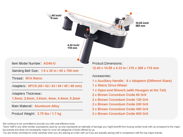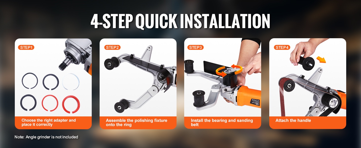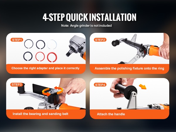 - Nopea 4-vaiheinen asennus: sovittimen valinta, kiinnikkeen kokoaminen, laakerin ja hiomanauhan asennus, kahvan kiinnitys