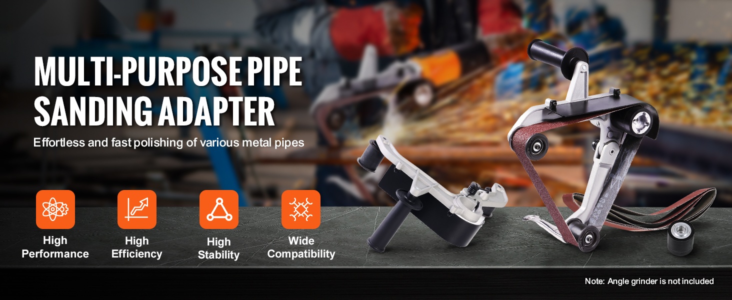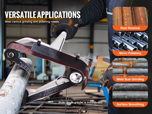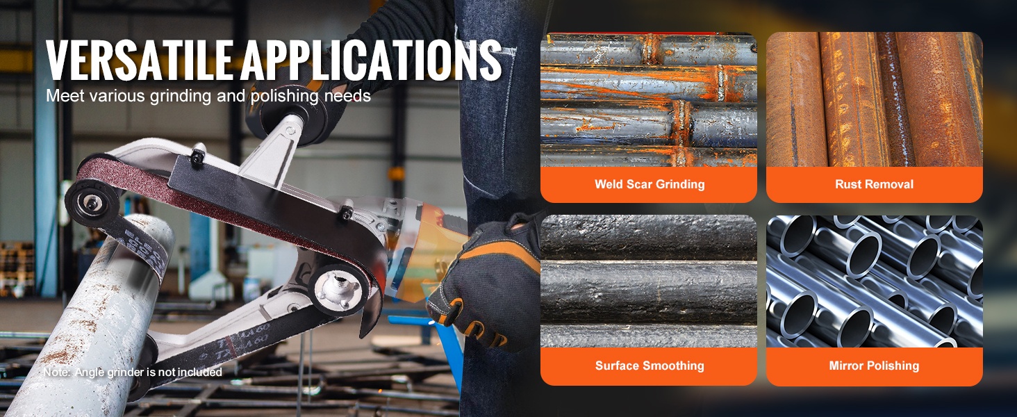 Muuta kulmahiomakone helposti putkien ja putkimaisten kappaleiden nauhahiomakoneeksi. M14-kierteellä varustettu hiomanauhasovitin mahdollistaa nopean ruosteenpoiston, hionnan ja kiillotuksen eri materiaaleille, kuten ruostumaton teräs, teräs, alumiini, muovi ja puu. Kompakti rakenne ja ergonominen kahva tekevät käytöstä kevyttä ja hallittua.