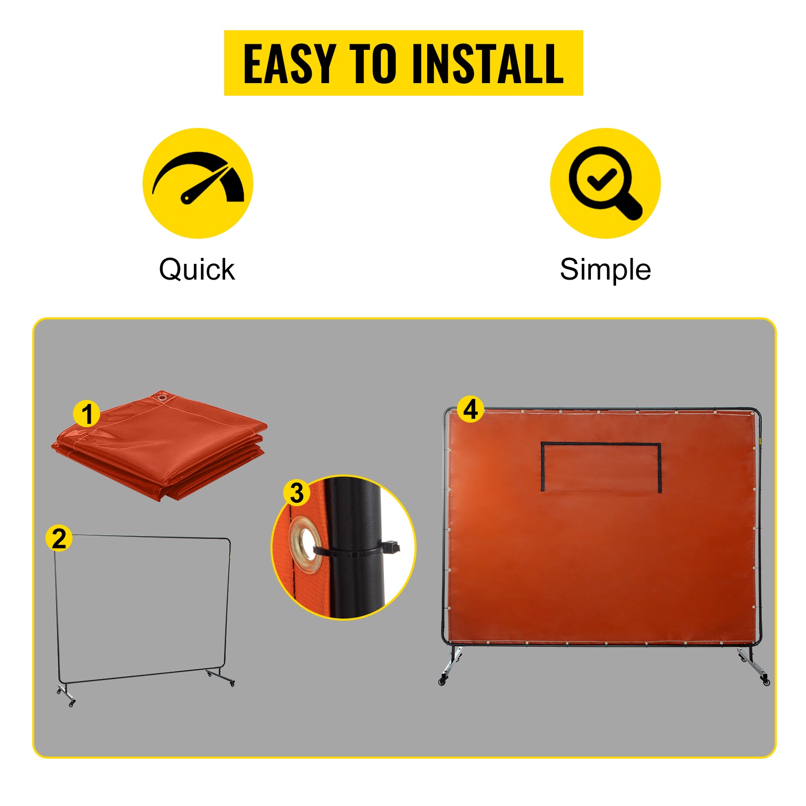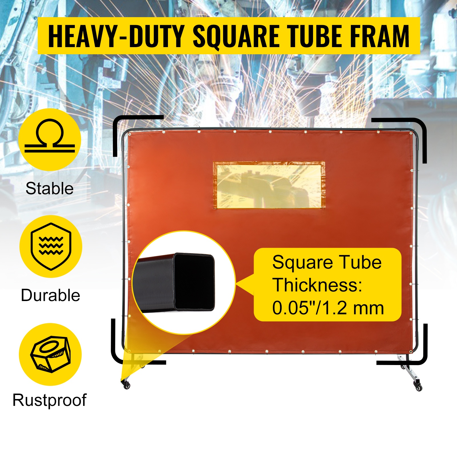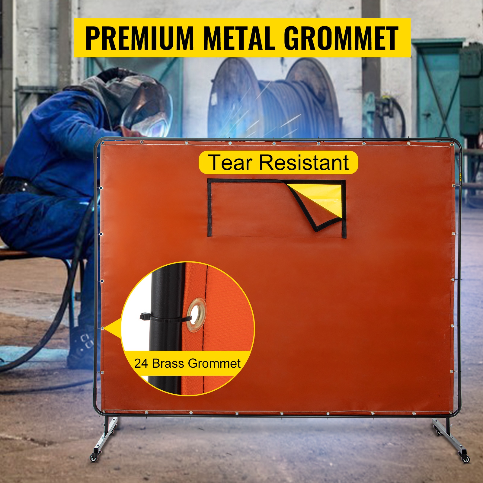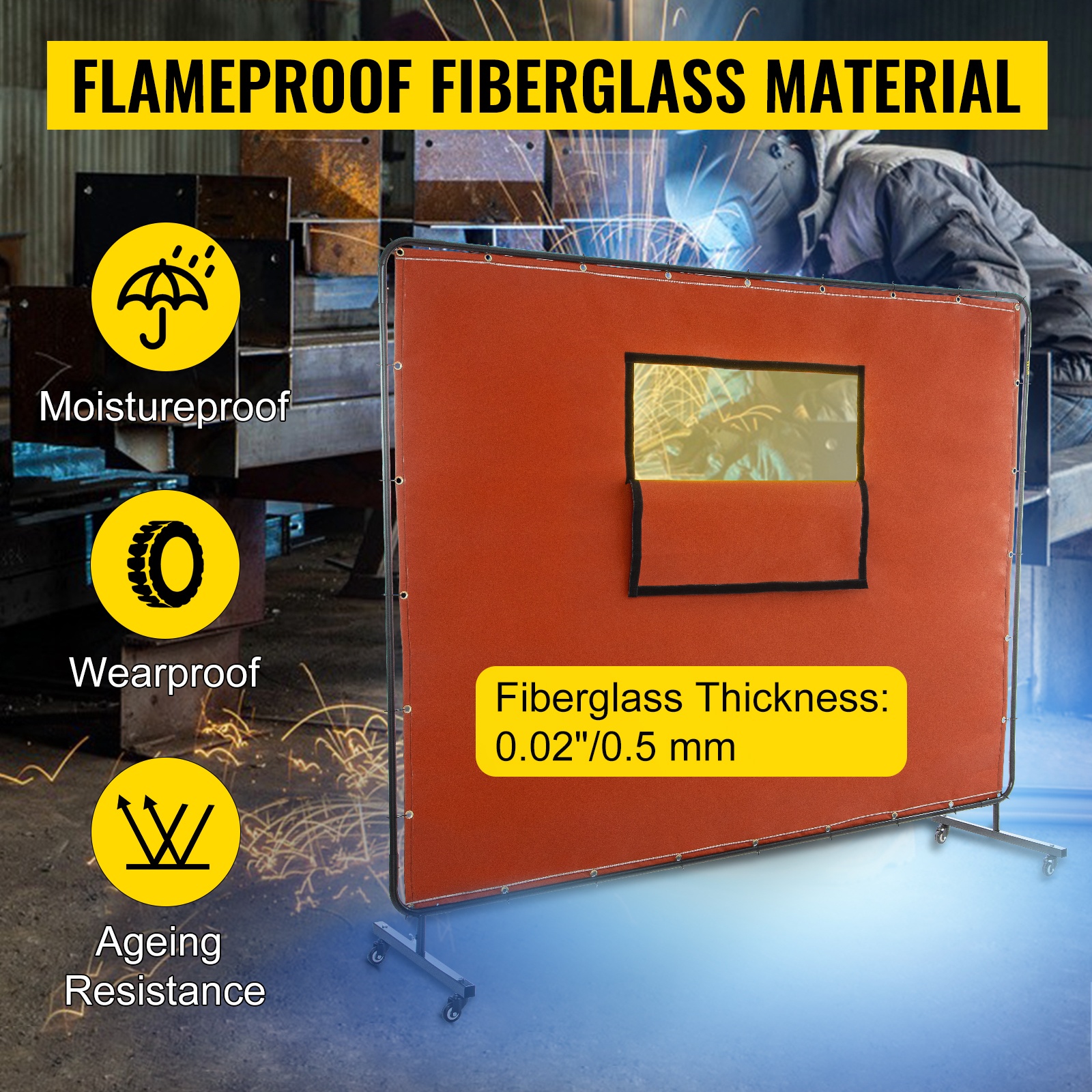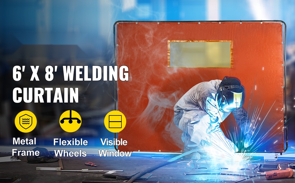 Hitsausverho, jonka koko on 6' x 8', on suunniteltu suojaamaan sivullisia kipinöiltä, roiskeilta ja haitalliselta UV-säteilyltä. Kevyt mutta tukeva metallirunko, neljä pyörää ja palonkestävä lasikuituverho tekevät ratkaisusta käytännöllisen niin korjaamoihin kuin teollisiin kohteisiin.