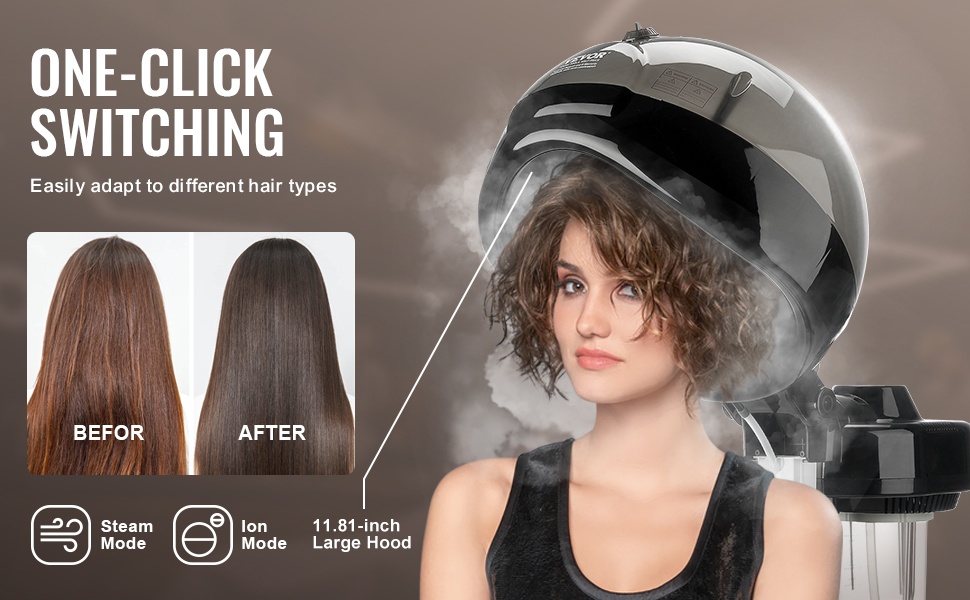 Nauti tasaisemman tuntuisista ja helpommin käsiteltävistä hiuksista jokaisella käyttökerralla. 2 höyrytasoa, ionitila, 11.81-tuumainen kupu ja säädettävä ajastin auttavat saavuttamaan salonkitasoisen lopputuloksen omassa kodissa.
