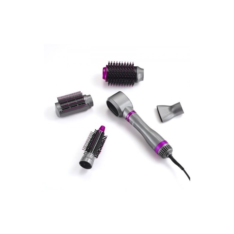 5-in-1-hiustenkuivausharja toimitetaan 3 harjapäällä ja 2 suuttimella (pyöröharja, lapioharja, ovaaliharja, pyöreä muotoilurulla ja keskitetty suutin). Näiden avulla voi tehdä esimerkiksi sileän föönatun tyylin, tuuhean tyven, loivat laineet tai selkeämmät kiharat.