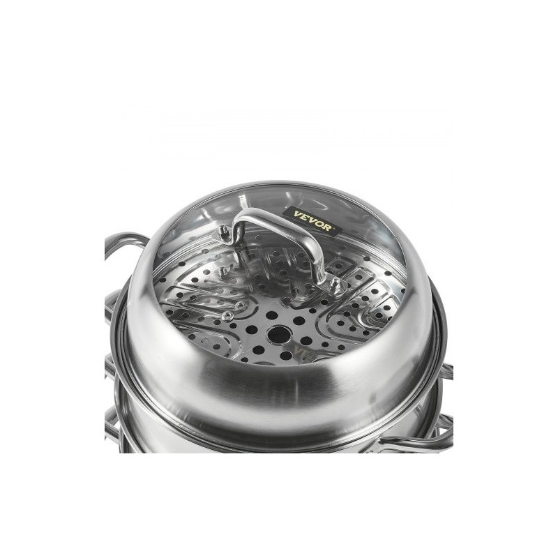 Tässä 5-kerroksisessa ruostumattomasta teräksestä valmistetussa höyrykattilassa voit höyryttää vihanneksia, nyyttejä, riisiä, kalaa ja muita ruokia säilyttäen niiden rakenteen ja maun. Kattila on valmistettu 304-elintarvikelaatuisesta ruostumattomasta teräksestä ja sen pohjassa on kolmikerroksinen komposiittirakenne, joka jakaa lämmön tasaisesti ja sopii useimmille liesityypeille, kuten kaasu-, keraamisille, halogeeni- ja induktioliesille. Viisi höyrytasoa tarjoavat runsaasti tilaa ruoanvalmistukseen.