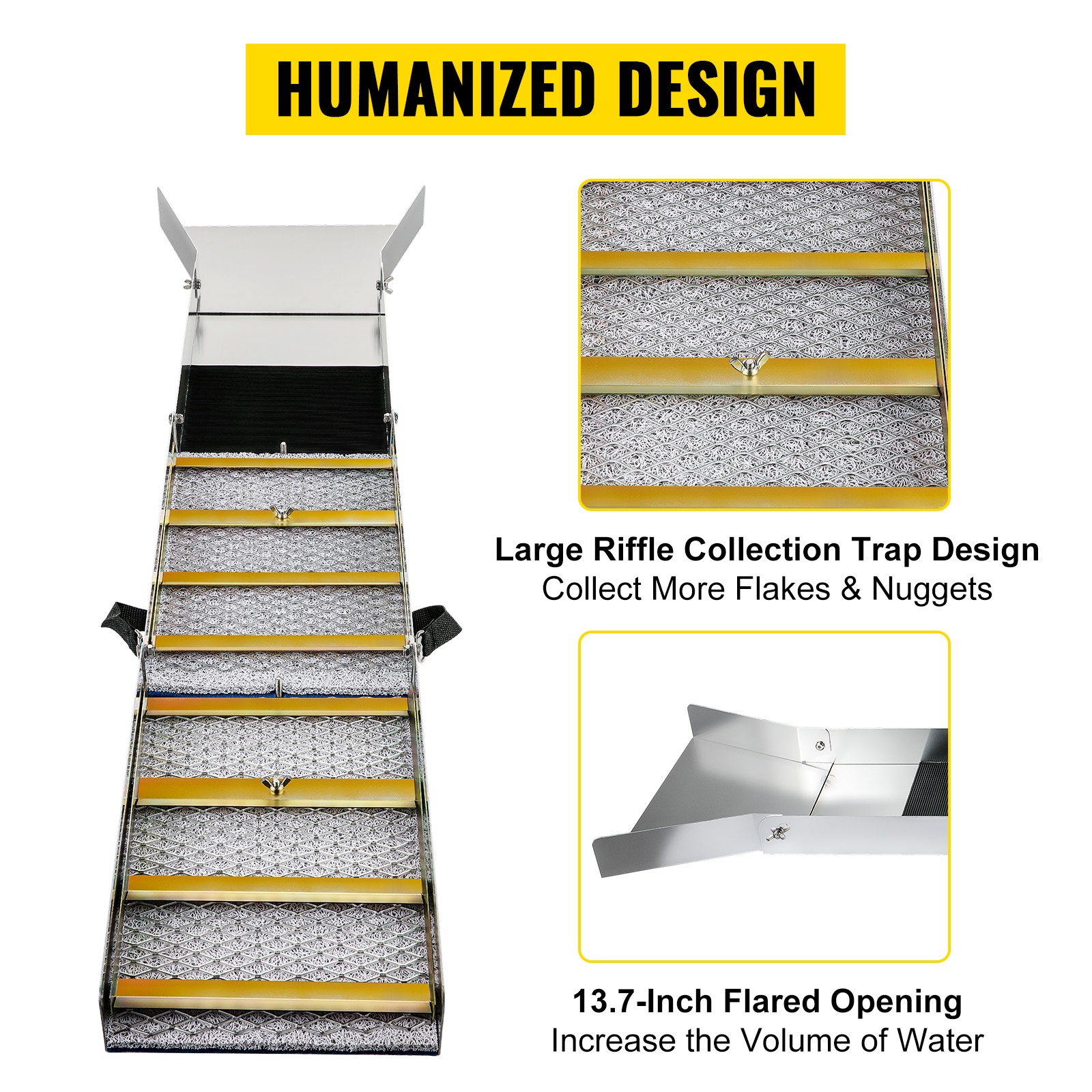 Muotoiltu kohoumien keräysalue auttaa keräämään helposti sekä pienet hiput että suuremmat kultakimpaleet. 13.7-tuumainen levennetty suuaukko lisää kouruun tulevan veden määrää ja parantaa rikasteen käsittelyä. Kulmaa voi säätää noin 10 astetta siipiruuveilla.
